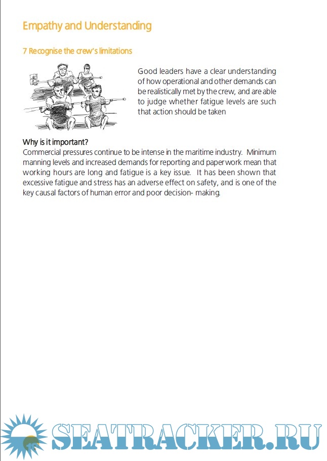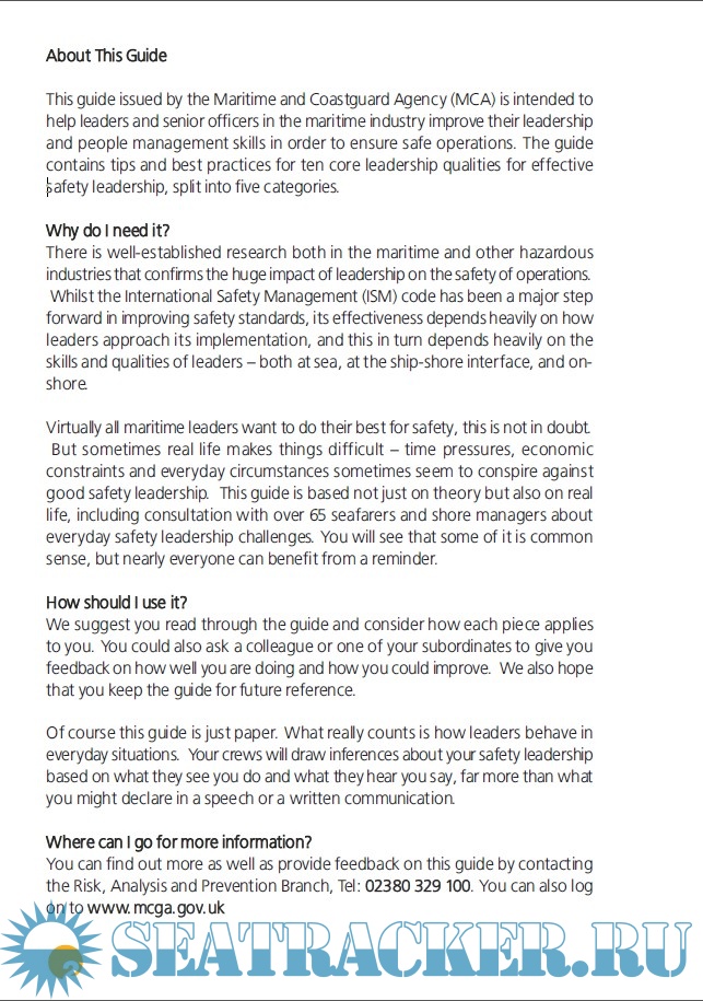 Description: This guide issued by the Maritime and CoastGuard Agency (MCA) is intended to help senior officers and leaders in the maritime industry improve their leadership and people management skills in order to ensure safe operations. The guide contains tips and best practices for ten core leadership qualities for effective safety leadership, split into five categories.