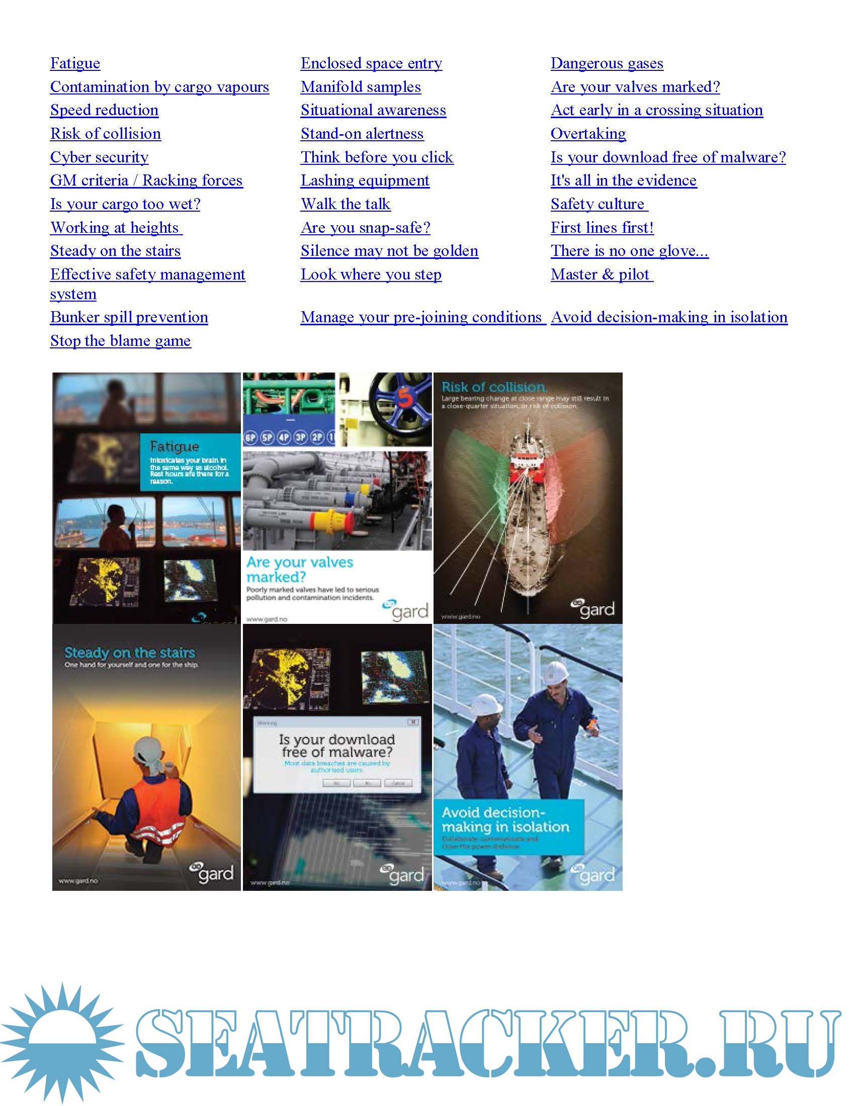 Description: It is important to raise the awareness of safety issues among our seafarers to contribute to the prevention of accidents on board ships. To assist in this effort, Gard has developed safety posters focussing on a range of issues linked to ship board operations.