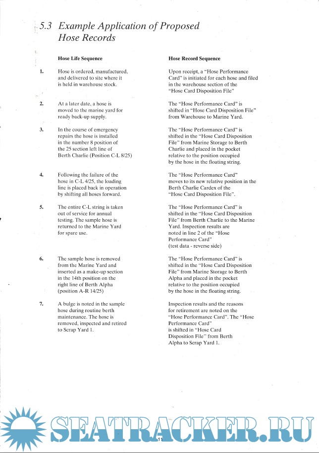 Description: At Offshore mooring installations, the hose strings are a critical link between the terminal and tanker. They are constantly subjected to the dynamic forces of the sea which can result in severe loads and stresses within the hose. To provide greater reliability and longer life, it is imperative that the hose be handled and stored correctly and be inspected and tested in a consistent manner at appropriate intervals.