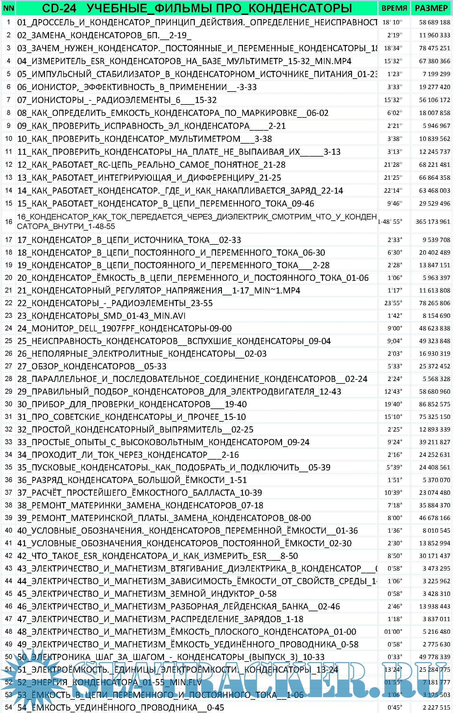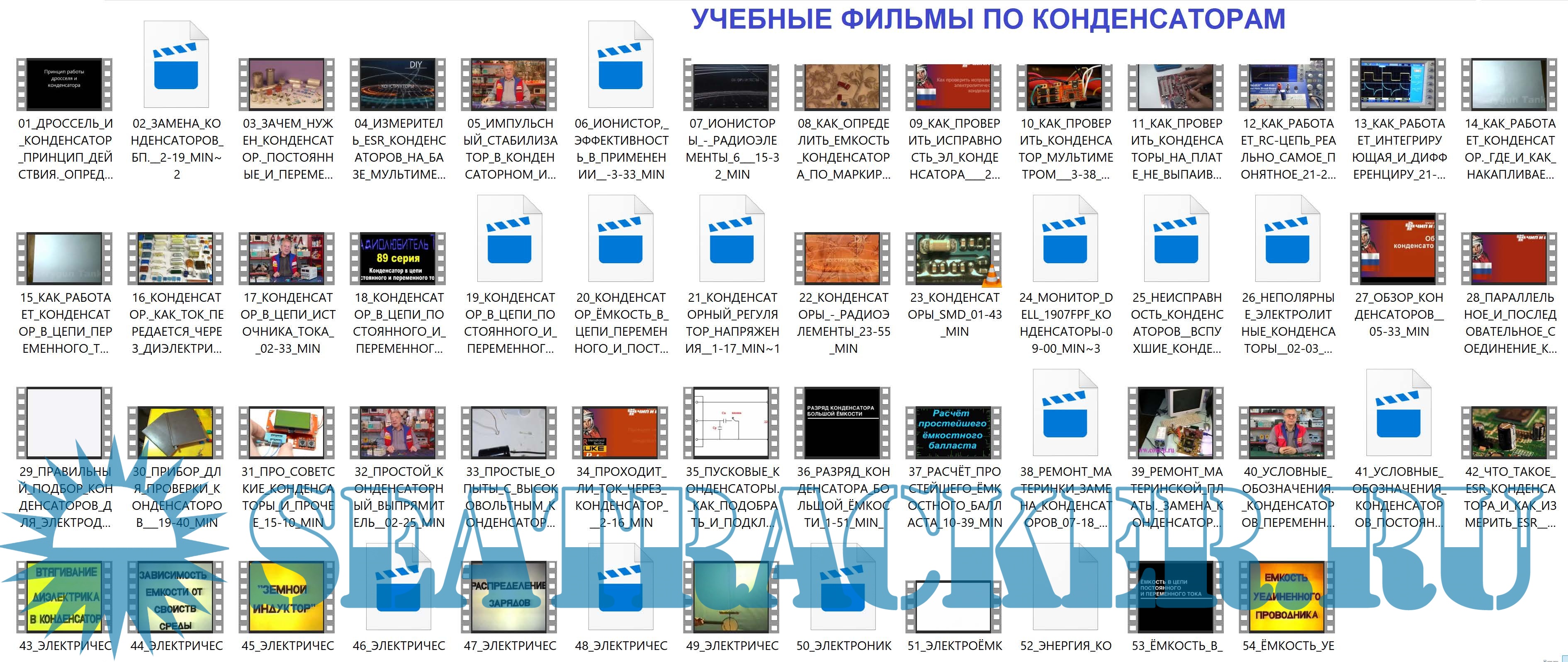 Более 50 учебных фильмов поможет понять физический смысл работы электрических конденсаторов, их конструкцию ( физический вид), типы, правила применения ( замены в устройствах), маркировку и т.п.