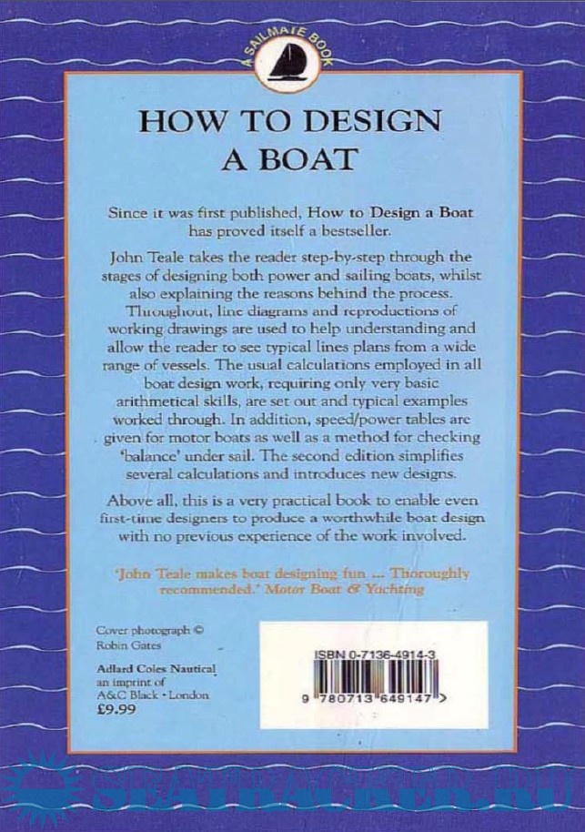 Year: 1998 Language: english Author: John Teale Genre: Technical book Publisher: Adlard Coles Nautical Edition: 2nd ISBN: 0-7136-4914-3 Format: PDF Quality: eBook Pages count: 160 Description: From the Back Cover: There is nothing magical or particularly brilliant about designing a boat, and you don't need to be an Einstein or a Leonardo da Vinci to sketch out the sort of craft that appeals to you. Indeed this first sketch that many potential owners will have made at some time is the most important part of a design. It needs only the bare bones to be fleshed out and some checks and balances to complete the design process. This may take a little time but it certainly isn't difficult. And the same processes apply for a dinghy as well as a cruising yacht. John Teale takes the reader step-by-step through the stages of designing both power and sailing boats, while also explaining the reasons behind the process. Sketches and reproductions of working drawings are used throughout to help understanding so that by the end of the book even a first time designer's effort can be translated by a builder into a sensible and workmanlike reality. Since it was first published, How to Design a Boat has proved itself a bestseller. The second edition simplifies several calculations and introduces new designs. About the Author: John Teale is a naval architect. He was technical editor of Motor Boat & Yachting for some years. His design work has ranged from fast power boats and motor cruisers, to passenger ferries, fishing boats and cruising yachts. Virtually all his designs are 'one-offs' and have been built all over the world.