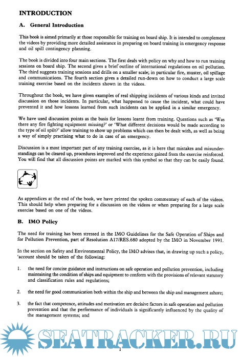 Year: 1992 Language: english Author: Videotel Genre: Training courses Publisher: Witherby & Co. Ltd. Format: PDF Quality: Scanned pages Pages count: 63 Description: This book is aimed primarily at those responsible for training onboard ship. It is intended to copmlement the videos by providing more detailed assistance in preparing on board training in emergency response and oil spill contingency planning. Additional info: For video refer to No.9 in list: https://seatracker.club/viewtopic.php?t=44