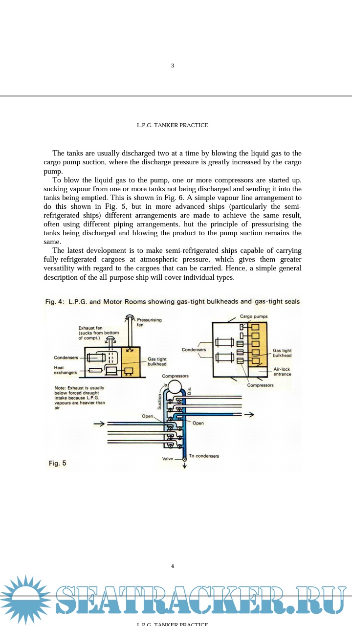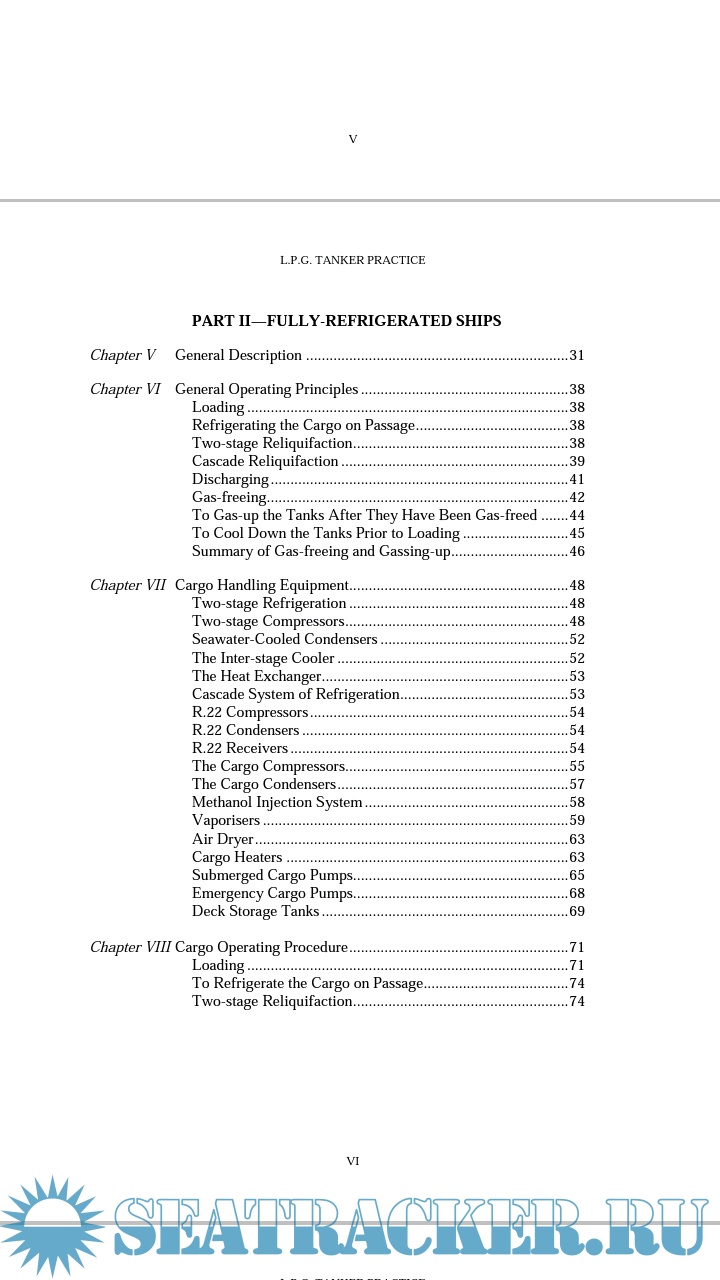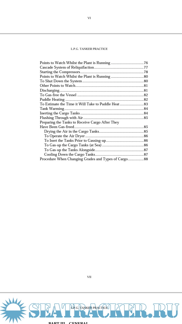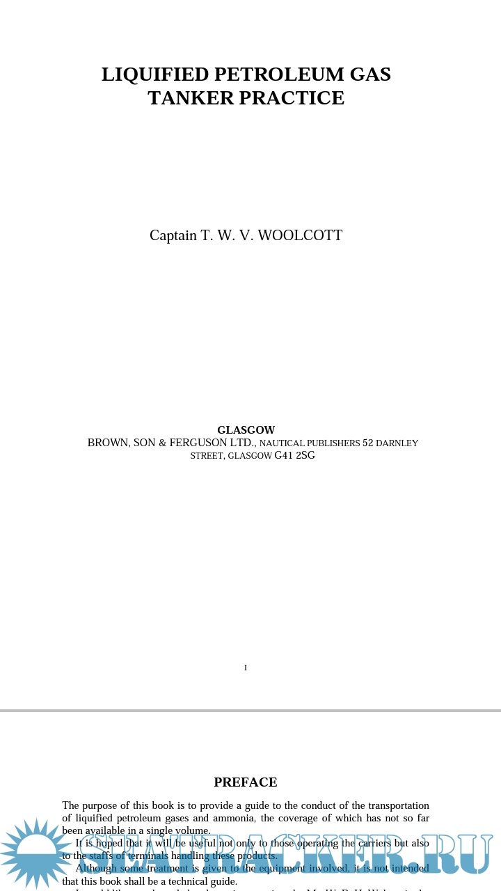 Year: 1977 Language: english Author: Captain T W V Woolcoot Genre: Technical book Publisher: Brown Son And ferguson Format: PDF Quality: eBook Pages count: 128 Description: The purpose of this book is to examine the technical problems involved in the transportation of L.P.G. and ammonia cargoes, and various other aspects of the running of L.P.G. Tankers. The detailed procedures at all stages will depend upon the conditions under which the cargoes are to be loaded, carried and discharged—whether under fullypressurised, semi-pressurised, or fully-refrigerated at atmospheric pressure conditions. 1. Preparation: At the point of loading, the cargo tanks should have been prepared, so far as is possible, for the reception of the cargo to be carried. The procedure involved, and the degree of readiness would depend upon whether the vessel is loading: (a) a consecutive cargo of the same type; (b) a cargo of a different nature, but compatible with the previous cargo, e.g. butane after propane; (c) a cargo of a different nature, and incompatible with the previous cargo (e.g. to load propane after discharging ammonia would involve gas-freeing); or (d) a first cargo. 2. Loading: This involves differing procedures, depending upon the facilities offered at the loading terminal, e.g. whether or not a vapour return line (see Glossary) is provided. It covers calculations for ascertaining the correct soundings (depths of liquid) to load either a full cargo or a given quantity (part cargo), and to calculate afterwards as accurately as possible the quantity in fact loaded. 3. Transportation: This covers care of the cargo in transit to guard against loss of product; the running of the reliquifaction plant and ensuring that the cargo tanks do not become over-full due to the incorrect operation of the condensate returns from the reliquifaction plant; and the routine checking of tank pressures and adjusting the degree of refrigeration accordingly so that the vessel is ready to discharge on arrival at the terminal. 4. Discharging: The method of discharge will depend upon the facilities for discharge available at the receiving terminal, and the type of discharge required—if direct into fully-refrigerated storage or via the cargo heater into pressure storage. Additional info: None