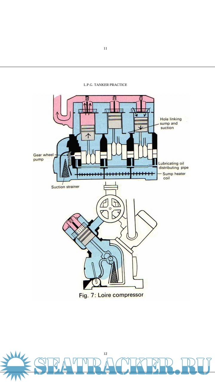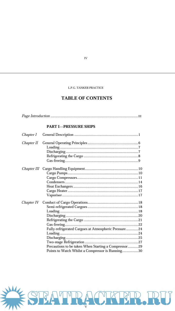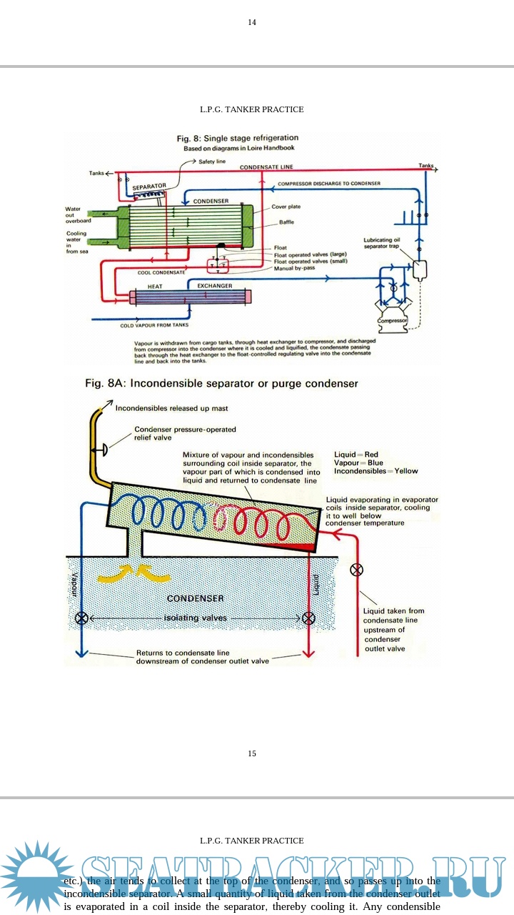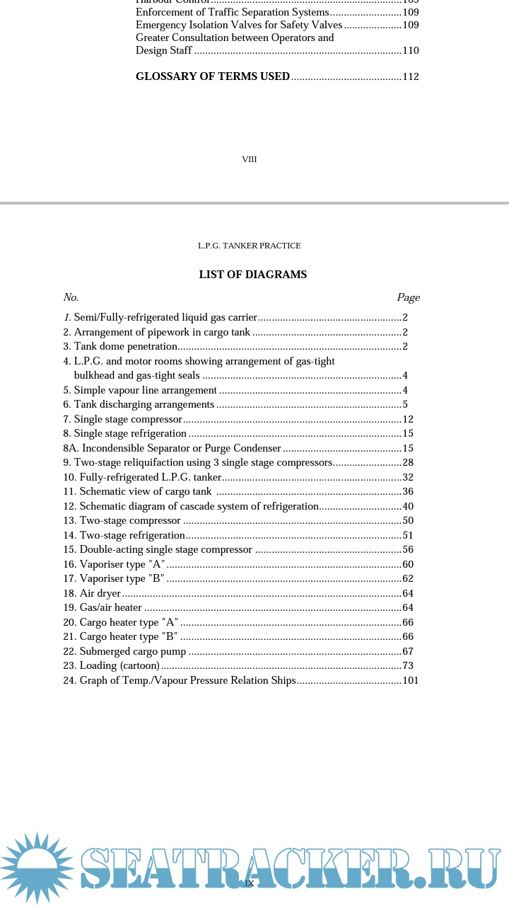 Year: 1977 Language: english Author: Captain T W V Woolcoot Genre: Technical book Publisher: Brown Son And ferguson Format: PDF Quality: eBook Pages count: 128 Description: The purpose of this book is to examine the technical problems involved in the transportation of L.P.G. and ammonia cargoes, and various other aspects of the running of L.P.G. Tankers. The detailed procedures at all stages will depend upon the conditions under which the cargoes are to be loaded, carried and discharged—whether under fullypressurised, semi-pressurised, or fully-refrigerated at atmospheric pressure conditions. 1. Preparation: At the point of loading, the cargo tanks should have been prepared, so far as is possible, for the reception of the cargo to be carried. The procedure involved, and the degree of readiness would depend upon whether the vessel is loading: (a) a consecutive cargo of the same type; (b) a cargo of a different nature, but compatible with the previous cargo, e.g. butane after propane; (c) a cargo of a different nature, and incompatible with the previous cargo (e.g. to load propane after discharging ammonia would involve gas-freeing); or (d) a first cargo. 2. Loading: This involves differing procedures, depending upon the facilities offered at the loading terminal, e.g. whether or not a vapour return line (see Glossary) is provided. It covers calculations for ascertaining the correct soundings (depths of liquid) to load either a full cargo or a given quantity (part cargo), and to calculate afterwards as accurately as possible the quantity in fact loaded. 3. Transportation: This covers care of the cargo in transit to guard against loss of product; the running of the reliquifaction plant and ensuring that the cargo tanks do not become over-full due to the incorrect operation of the condensate returns from the reliquifaction plant; and the routine checking of tank pressures and adjusting the degree of refrigeration accordingly so that the vessel is ready to discharge on arrival at the terminal. 4. Discharging: The method of discharge will depend upon the facilities for discharge available at the receiving terminal, and the type of discharge required—if direct into fully-refrigerated storage or via the cargo heater into pressure storage. Additional info: None
