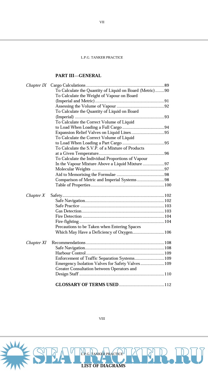 Description: The purpose of this book is to examine the technical problems involved in the transportation of L.P.G. and ammonia cargoes, and various other aspects of the running of L.P.G. Tankers. The detailed procedures at all stages will depend upon the conditions under which the cargoes are to be loaded, carried and discharged—whether under fullypressurised, semi-pressurised, or fully-refrigerated at atmospheric pressure conditions. 1. Preparation: At the point of loading, the cargo tanks should have been prepared, so far as is possible, for the reception of the cargo to be carried. The procedure involved, and the degree of readiness would depend upon whether the vessel is loading: (a) a consecutive cargo of the same type; (b) a cargo of a different nature, but compatible with the previous cargo, e.g. butane after propane; (c) a cargo of a different nature, and incompatible with the previous cargo (e.g. to load propane after discharging ammonia would involve gas-freeing); or (d) a first cargo. 2. Loading: This involves differing procedures, depending upon the facilities offered at the loading terminal, e.g. whether or not a vapour return line (see Glossary) is provided. It covers calculations for ascertaining the correct soundings (depths of liquid) to load either a full cargo or a given quantity (part cargo), and to calculate afterwards as accurately as possible the quantity in fact loaded. 3. Transportation: This covers care of the cargo in transit to guard against loss of product; the running of the reliquifaction plant and ensuring that the cargo tanks do not become over-full due to the incorrect operation of the condensate returns from the reliquifaction plant; and the routine checking of tank pressures and adjusting the degree of refrigeration accordingly so that the vessel is ready to discharge on arrival at the terminal. 4. Discharging: The method of discharge will depend upon the facilities for discharge available at the receiving terminal, and the type of discharge required—if direct into fully-refrigerated storage or via the cargo heater into pressure storage.