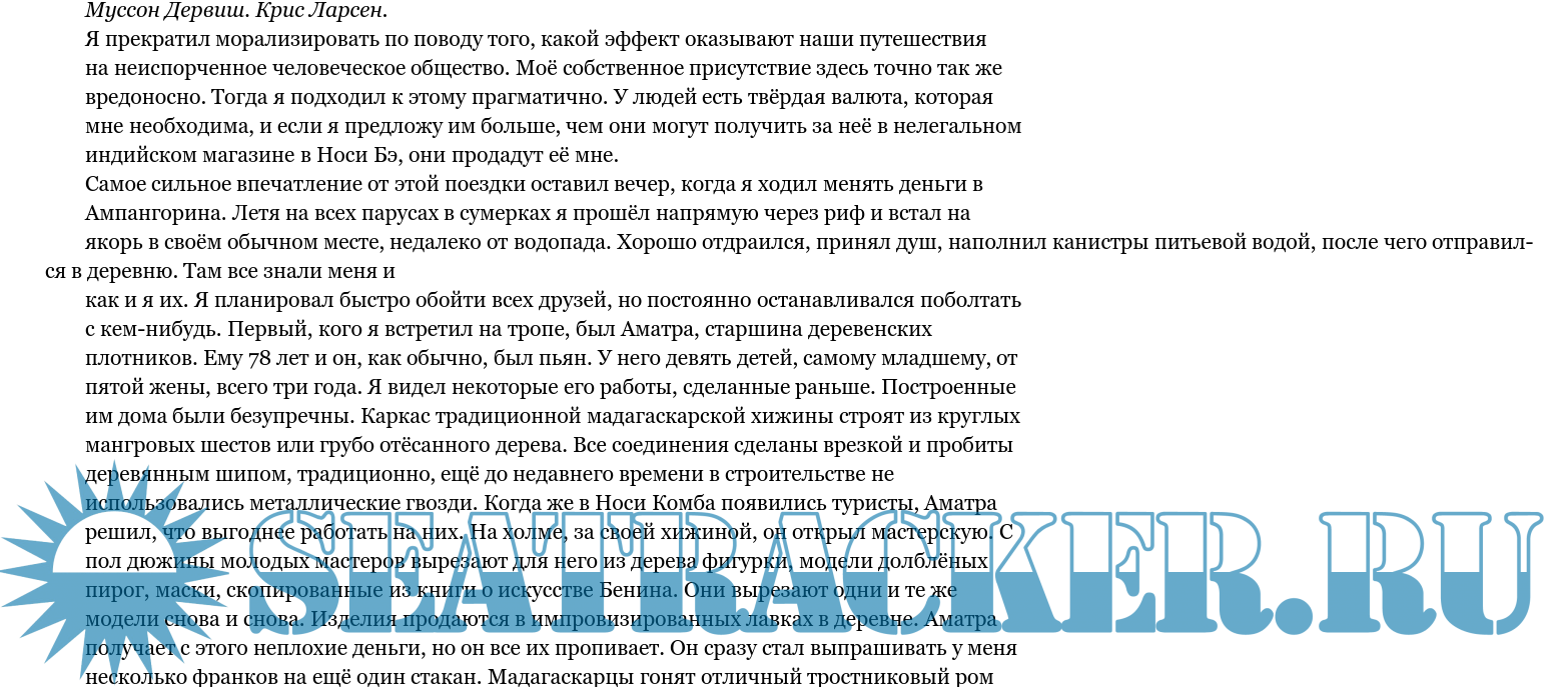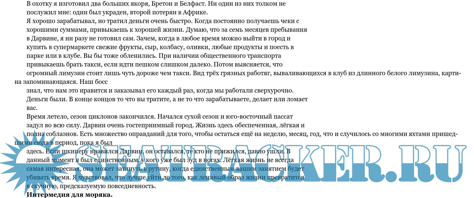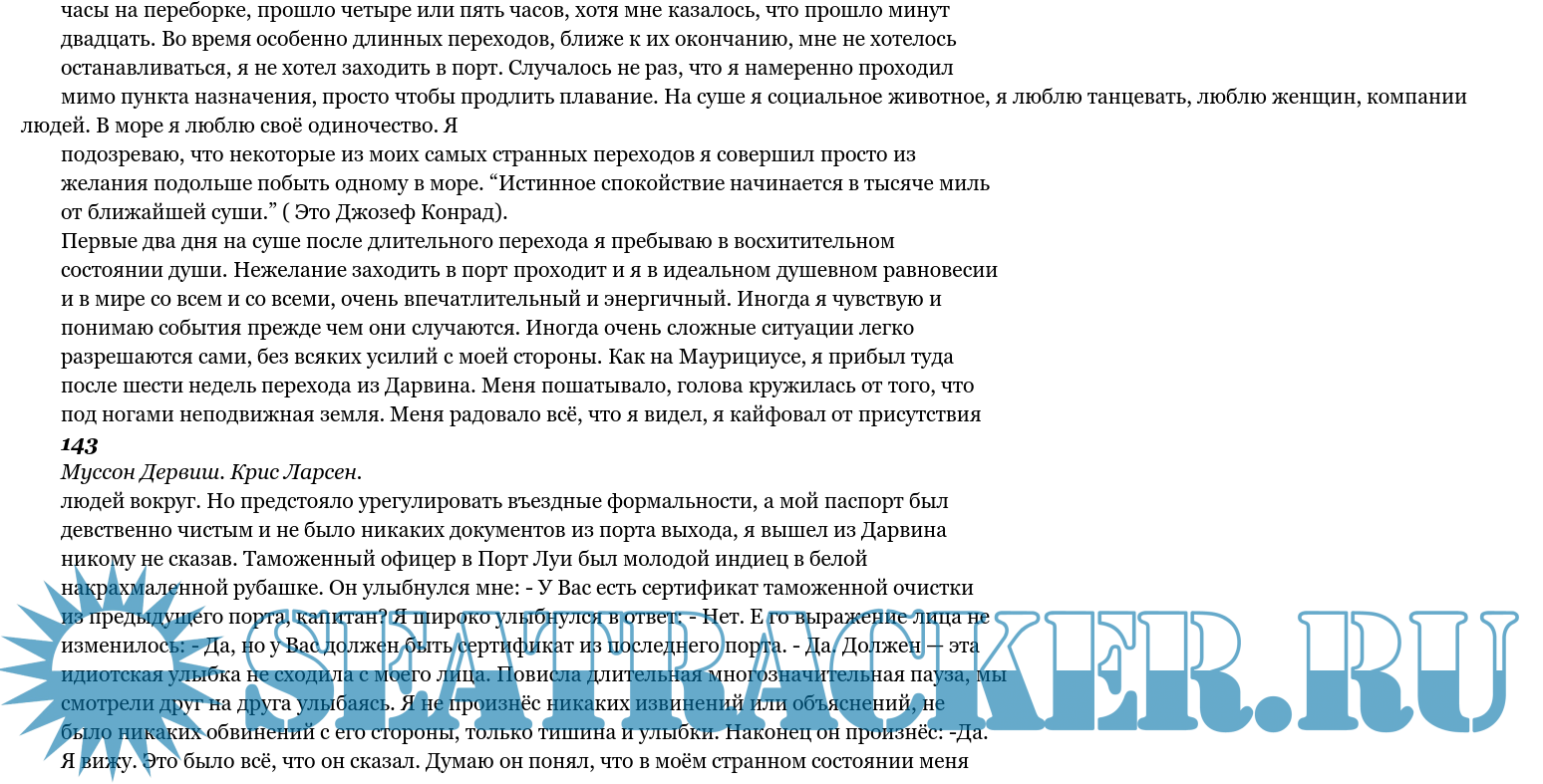 Год выпуска: 2007 Язык: русский Автор: Крис Ларсен / Kris Larsen Жанр: Художественная литература Формат: FB2 Качество: Изначально компьютерное (eBook) Количество страниц: 185 Описание: Муссон Дервиш. Правдивая история о бедах и злоключениях во время путешествий джонки «Кехаар» на острова Мадагаскар, Занзибар, Цейлон и в труднодоступную Японию, а также в Австралию и Ост Индию, совершённых к вящей славе Божией, на рубеже тысячелетий капитаном вышеназванного судна, небезызвестным Крисом Ларсеном. Мечтайте. День, когда вы перестанете мечтать, это день вашей смерти.