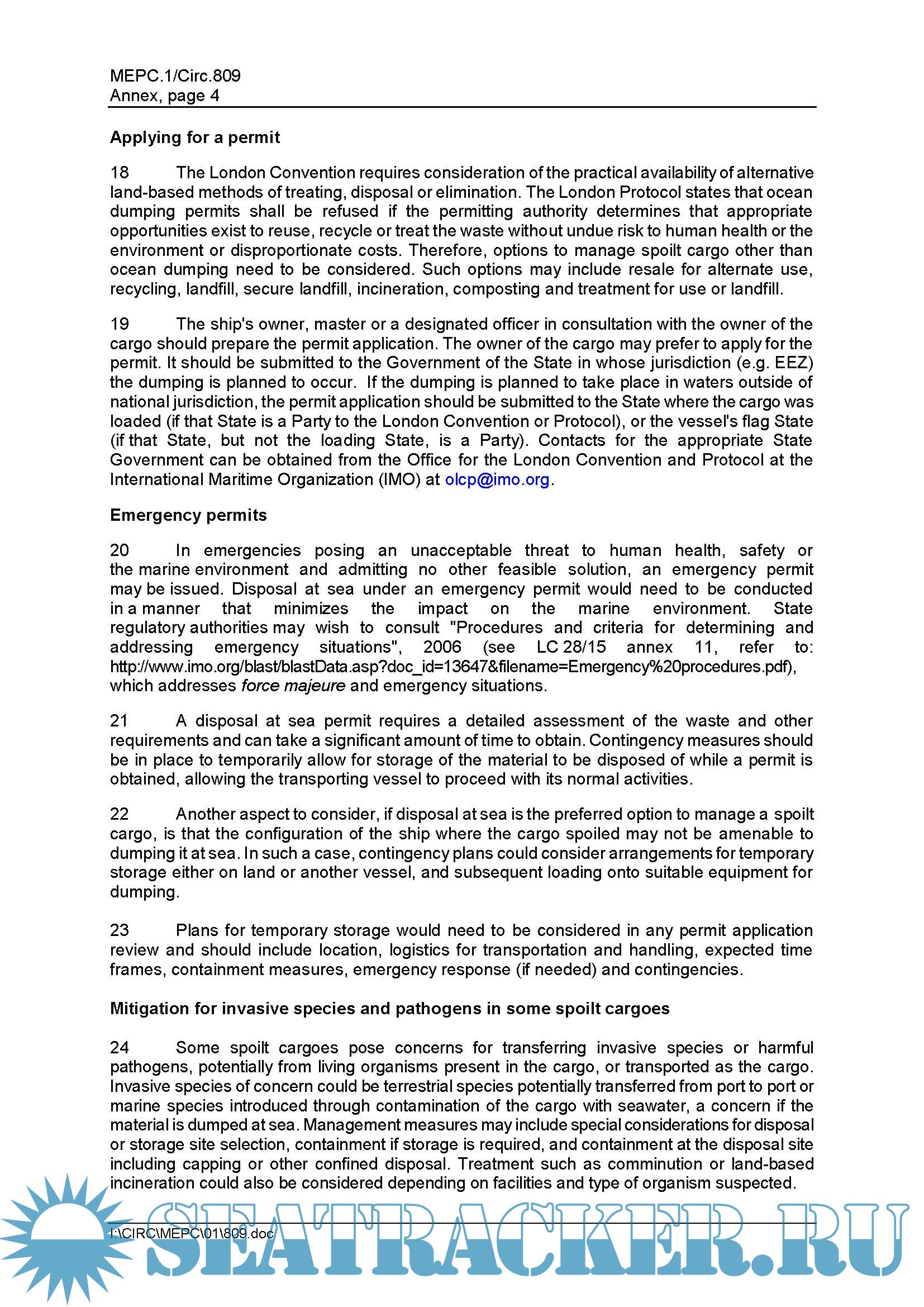 Page 3 Introduction Page 3 Applicability of the London Convention and Protocol (LC/LP) and MARPOL Annex V to the management of spoilt cargoes Page 4 Specific spoilt cargoes Page 5 Contingency plans for the management of spoilt cargo Page 5 Considerations for documenting spoilt cargo Page 6 Applying for a permit Page 6 Emergency permits Page 6 Mitigation for invasive species and pathogens in some spoilt cargoes Page 7 Alternative options when dumping at sea is not allowed Page 7 Treatment of animal carcasses Page 9 ANNEX - SPOILT Cargoes Considered for Sea Disposal