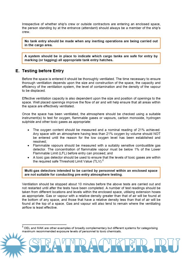 Description: The following guidanceand advice relates to enclosed space entry and rescue on board ships, and includes background in formationon the hazards and potential atmospheres that might accumulate in such spaces. It contains specific advice on pre-entry procedures,