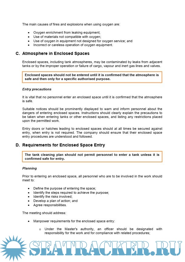 A. Introduction B. Hazards C. Atmosphere in Enclosed Spaces D. Requirements for Enclosed Space Entry E. Testing before Entry F. Enclosed Space Entry G. Work in Enclosed Spaces H. Entry into an Enclosed Space where the Atmosphere is Known or Suspected to be Unsafe I. Rescue from Cargo Tanks and Other Enclosed Spaces Appendix