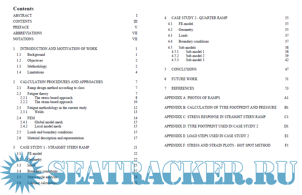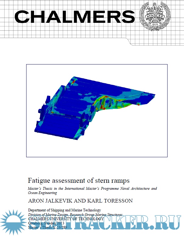 Year: 2013 Language: english Author: ARON JALKEVIK AND KARL TORESSON Format: PDF Quality: eBook Pages count: 82 Description: Master’s Thesis in the International Master’s Programme Naval Architecture and Ocean Engineering RoRo ships are an important ship type in transports at sea today. Reliable designs of their loading ramps are required to ensure the safe and efficient loading and unloading of cargo. Today, most ramps are designed against ultimate strength despite the fact that they are subjected to repeated loading from rolling cargo. The class rules, however, do not take fatigue damage into consideration. In this thesis, two RoRo ramps have been investigated from a fatigue point of view. An existing method for performing fatigue assessment and life estimations is to be modified to suit RoRo ramps in the future. The ramps investigated are a straight stern ramp and a quarter ramp. Two different methods have been used for investigating these ramps. On the straight stern ramp, fatigue damage has been found in the form of cracks in a specific area. Focus has therefore been on investigations of this area. First by stress analyses and subsequently by fatigue analyses based on these stresses. On the quarter ramp no such area is known and therefore a global stress analysis of the ramp has been performed to identify areas with stress concentrations and subsequently sub-models of these areas have been created to get more accurate stress levels in these areas. After the local stresses have been calculated, the stresses are used for estimating the fatigue life of the structure. For the fatigue assessment of the ramps, mainly the stress-based approach has been applied. The number of cycles to failure has been calculated and estimations of the load spectrum were made in order to give an approximation of the fatigue life.