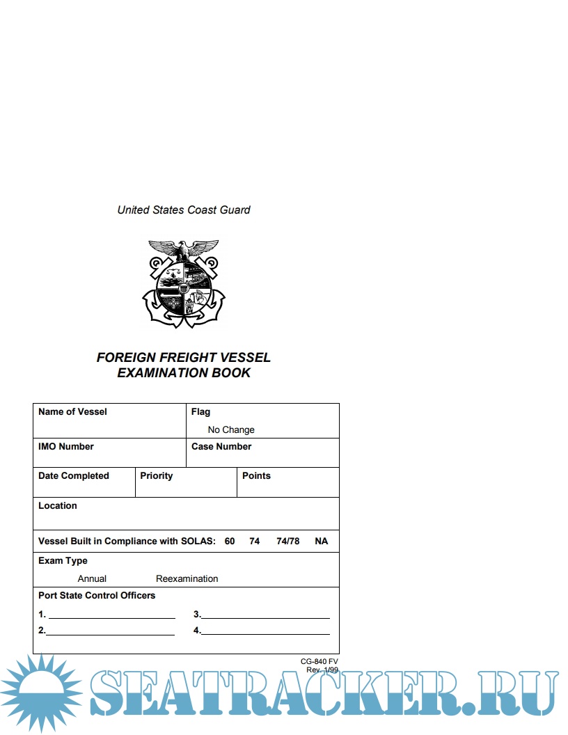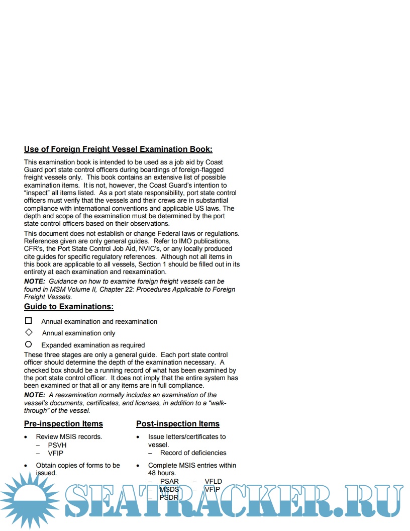 Year: 2009 Language: english Author: United States Coast Guard Genre: Reference book Publisher: United States Coast Guard Format: PDF Quality: eBook Pages count: 48 Description: This examination book is intended to be used as a job aid by Coast Guard port state control officers during boardings of foreign-flagged freight vessels only. This book contains an extensive list of possible examination items.