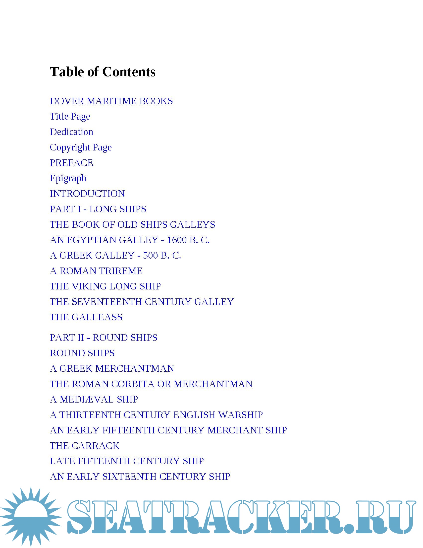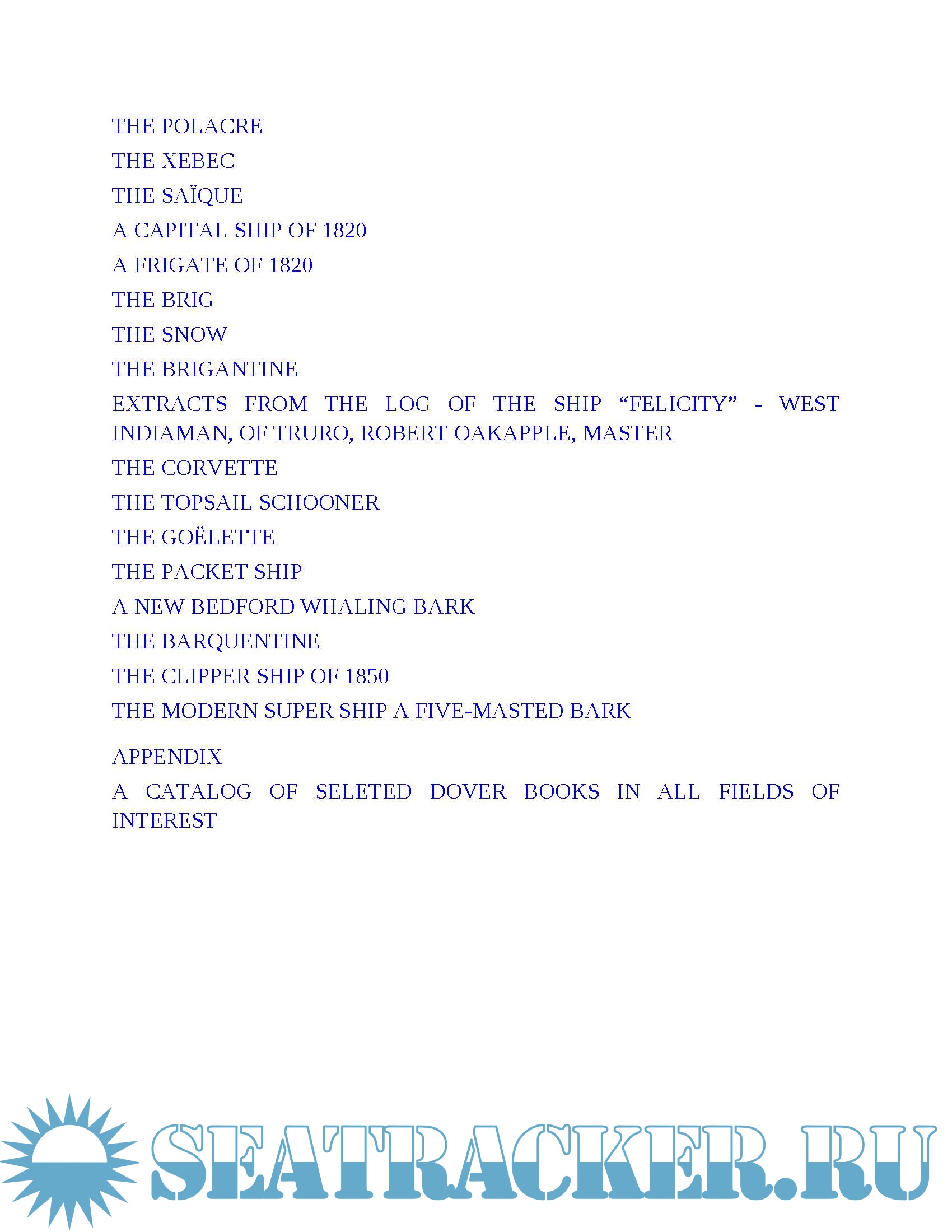 Year: 1992 Language: english Author: Henry B. Culver Genre: Handbook Publisher: Dover Publications Format: PDF Quality: eBook Pages count: 236 Description: Of all the ships human beings have constructed to navigate the waters of the world — from a hollowed-out log sharpened at both ends to modern ocean liners weighing thousands of tons — those powered by the wind are among the most interesting and beautiful. In this classic review, noted maritime artist Gordon Grant has created 80 magnificent line illustrations of some of history's most important sailing ships, beginning with a graceful Egyptian galley (c. 1600 B.C.) and ending with a splendid five-masted clipper ship of 1921. Also depicted are a Roman trireme, a Viking longship, a sixteenth-century caravel, an East Indiaman of 1750, an early nineteenth-century brigantine, a New Bedford whaling bark, and dozens of lesser-known vessels, among them the galleass, carrack, buss, and flute. Henry B. Culver, well-known authority on naval history, has provided a detailed, meticulously researched text for each vessel, describing the materials and details of construction, how the ship's design matched its function, the period in which the vessel flourished, romance and lore surrounding the craft, and more. Naval historians and model shipbuilders will value this work as an excellent sourcebook and reference with much information on the evolution of sailing vessels, the origins of shipping, customs of the sea and other pertinent matters; sailing enthusiasts will find it a wonderful browsing book, offering an informative, handsomely illustrated look back at 3,000 years of sailing history.