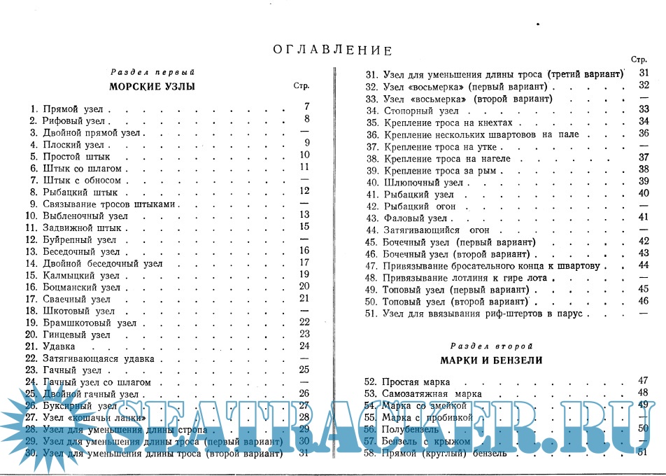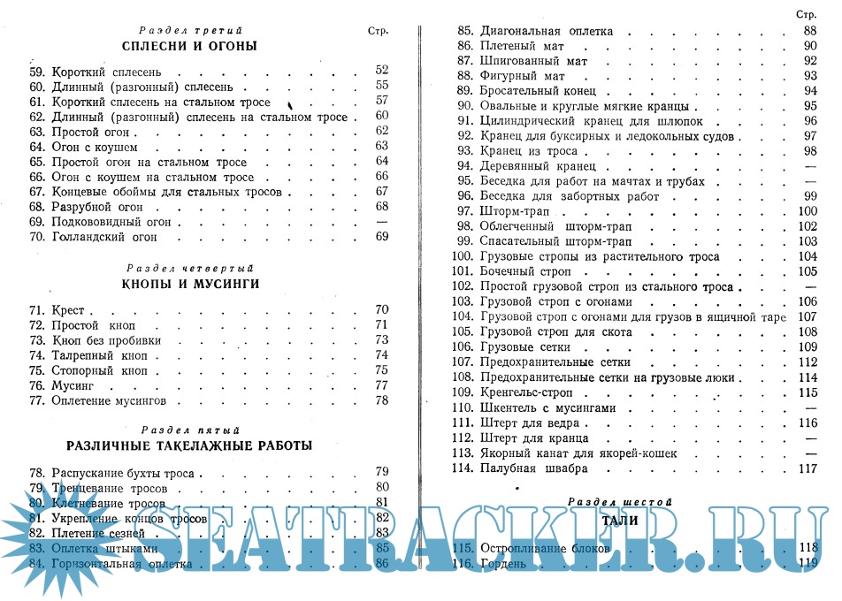 В Атласе приводятся способы вязания морских узлов, сведения о наиболее распространенных бензелях, сплеснях, огонах, кнопах, а также материалы о плетении матов, изготовлении кранцев, стропов, пластырей, чехлов и т.д.