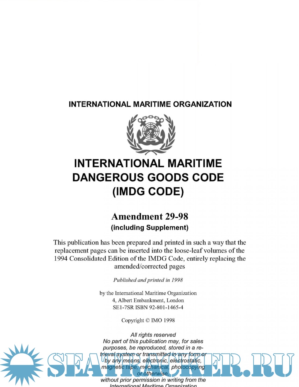 Description: Amendment 29-98 to the International Maritime Dangerous Goods Code (IMDG Code) was adopted by the Maritime Safety Committee of IMO at its sixty-ninth session (May 1998).