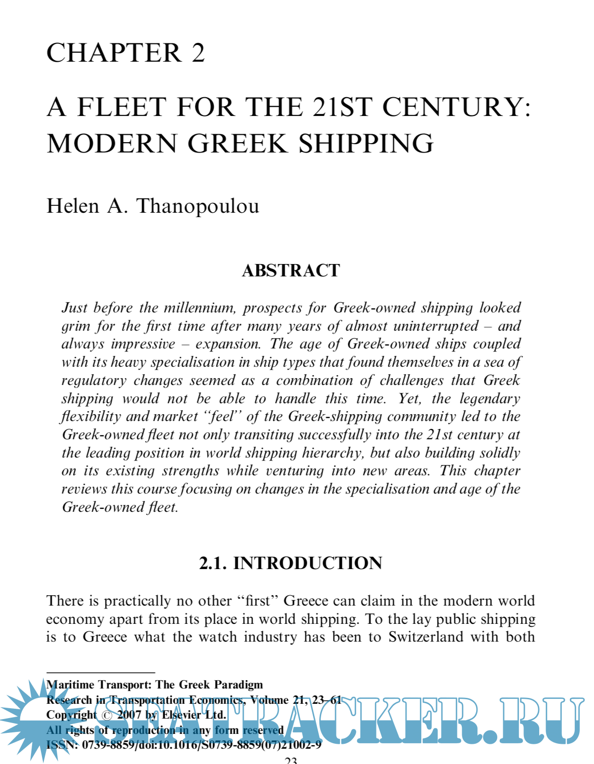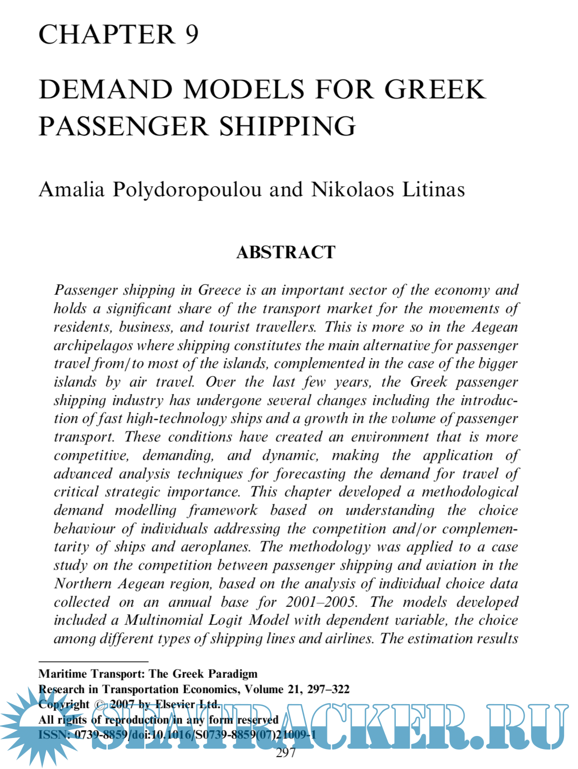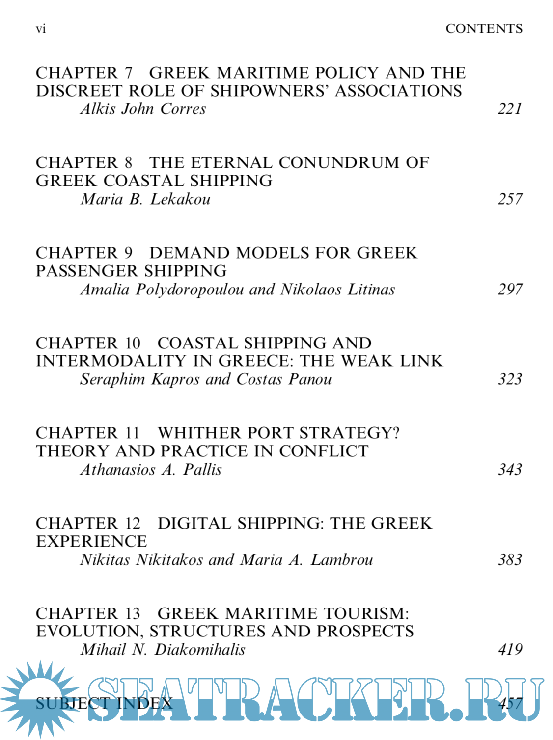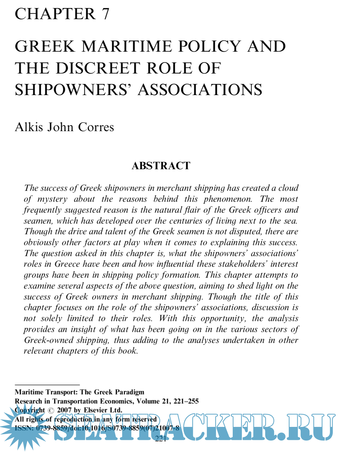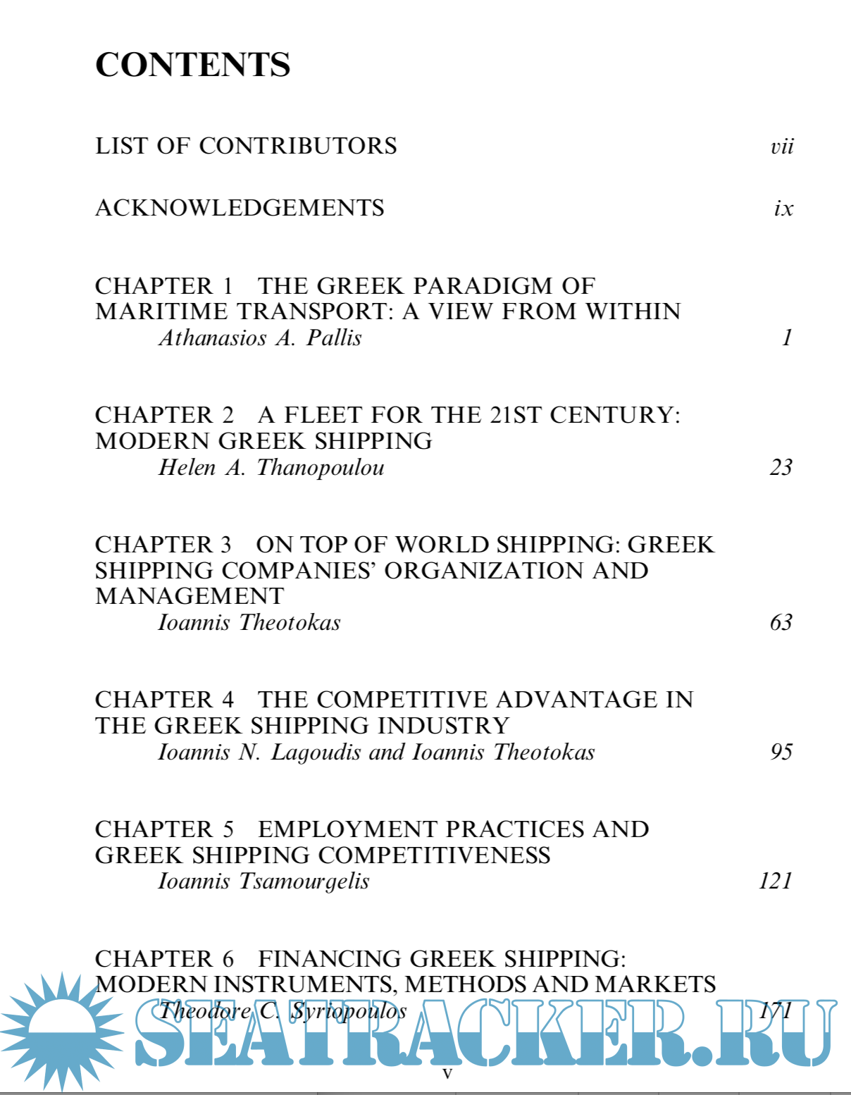 Year: 2007 Language: english Author: ATHANASIOS A. PALLIS Genre: Reference book Publisher: ELSEVIER ISBN: 978-0-7623-1449-2 Format: PDF Quality: OCR with errors Pages count: 474 Description: The Greek case provides a unique paradigm of maritime transport and is among those worthy of a closer examination. Surprisingly, a systematic review of its various facets of Greek maritime transport has been unavailable in the international literature aiming to fill some of the gaps in the international literature of maritime transport studies as regards this unique paradigm. This volume provides an analysis of the ways that the Greek paradigm of maritime transport developed and continues to evolve and adjust. The extensive range of topics covered includes shipping ownership, management and organization, shipping finance, supply chains approaches of shipping, employment at sea, coastal shipping, maritime transport and intermodalism, port strategy developments, digital maritime transport, and maritime tourism.