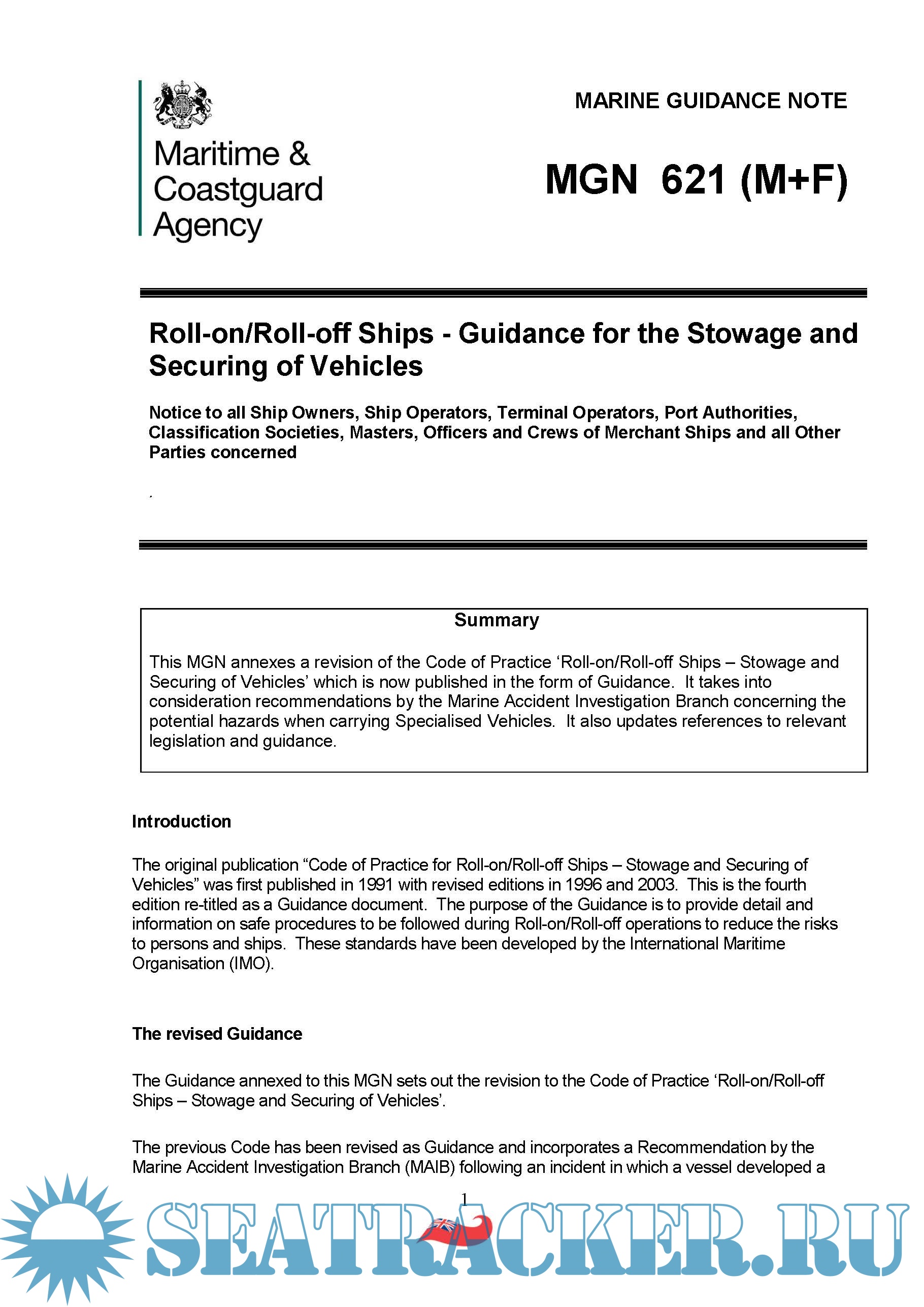 MARINE GUIDANCE NOTE MGN 621 (M+F), Roll-on/Roll-off Ships -Guidance for the Stowage and Securing of Vehicles