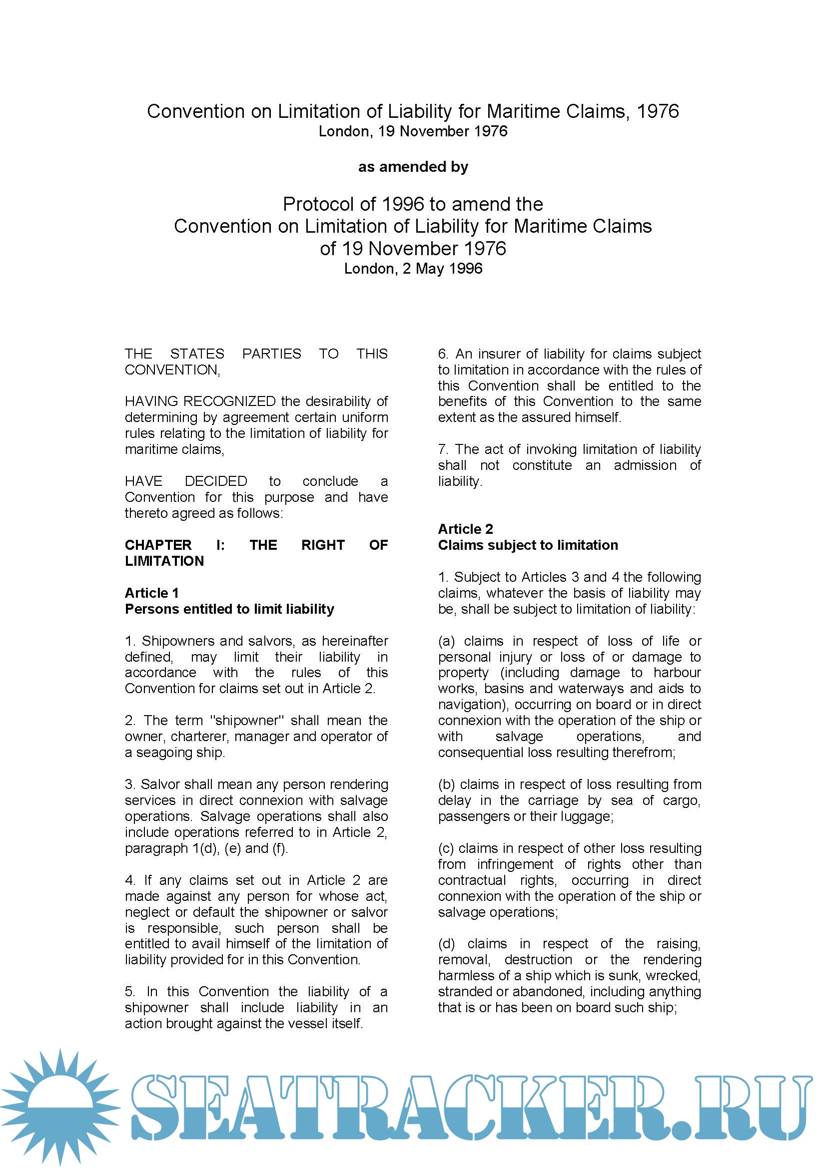 Page : 1 CHAPTER I : Article 1: Persons entitled to limit liability, Article 2: Claims subject to limitation,Page : 2 CHAPTER I : Article 3: Claims excepted from limitation, Article 4: Conduct barring limitation and Article 5: Counterclaims.