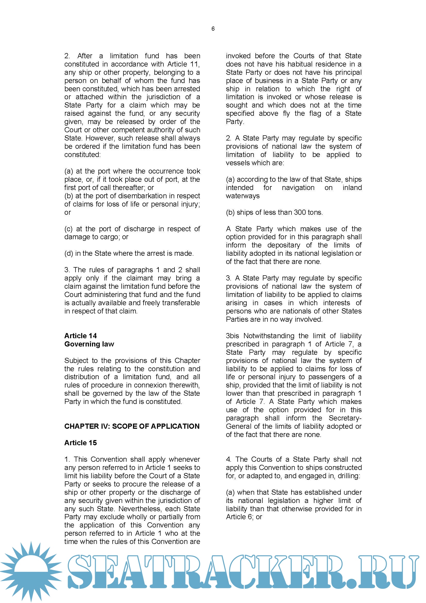 Page : 1 CHAPTER I : Article 1: Persons entitled to limit liability, Article 2: Claims subject to limitation, Page : 2 CHAPTER I : Article 3: Claims excepted from limitation, Article 4: Conduct barring limitation and Article 5: Counterclaims. Page : 2 CHAPTER II: LIMITS OF LIABILITY Page : 5 CHAPTER III: THE LIMITATION FUND Page : 6 CHAPTER IV: SCOPE OF APPLICATION Page : 7 CHAPTER V: FINAL CLAUSES