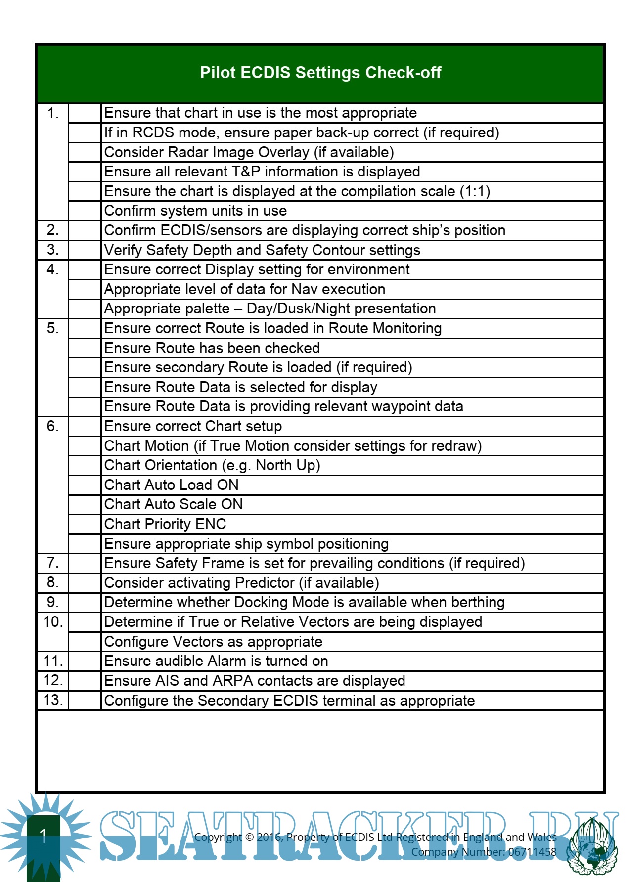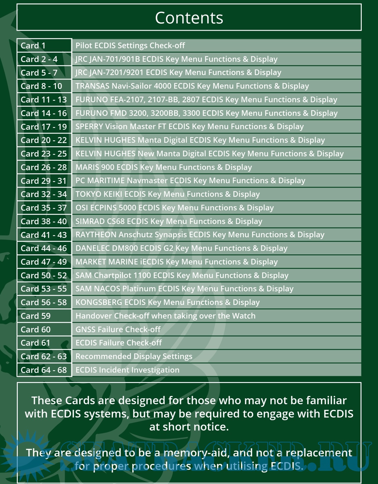 Pilot 'Check Off Cards- Various Manufacturers ECDIS
