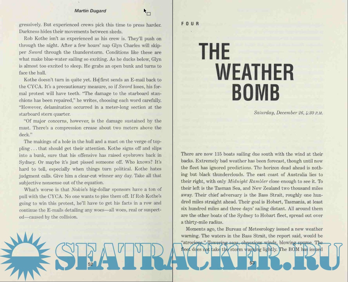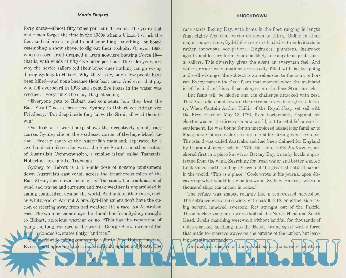 Description: In the world of blue water, or open ocean, yacht racing, the Sydney to Hobart challenge is considered one of the most treacherous races in the world. Nineteen-ninety-eight proved why. Slammed by a sudden freak storm that unleashed ninety-mile-per-hour winds and waves seven stories tall, twenty-four boats were abandoned at sea as sixty-three sailors fought for their lives. Six would die, including two who would never be found. Here, premier adventure writer Martin Dugard recreates the emotional saga of these windswept sailors -- survivors and victims alike -- shedding fascinating light on this extreme sport