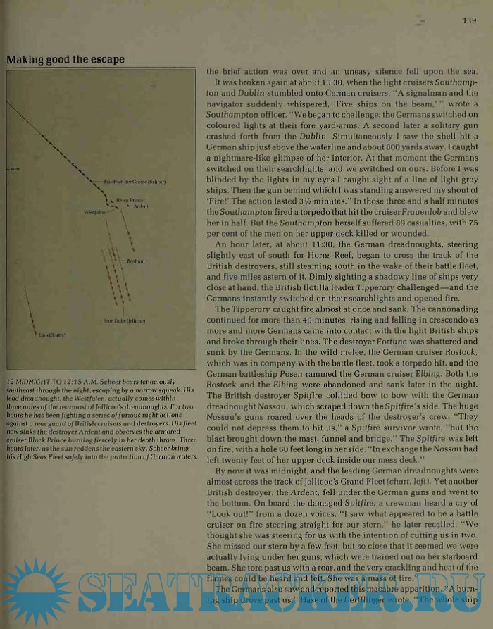 Chapter 5, "A duel of dreadnoughts: 50 minutes of fury," breaks down the height of the battle as the main fleets met that evening. A series of maps allow you to understand what is going on in general as well as the key moments of the engagement. The essay, "The drama of Jutland through a German's eyes," presents a series of watercolors by Claus Bergen, who was commissioned by the German Admiralty to depict the victory the Germans claimed (the British lost more ships and men, but the German's were denied their objective).