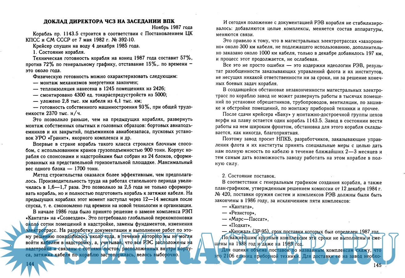 Описание: ПОСВЯЩАЕТСЯ 100 -летию "Черноморского судостроительного завода " Недавно я прочитал новые книги моего любимого писателя Владимира Васильевича Карпова'Маршал Жуков'. Книги замечательные. Изложение громадного материала в них построено необычно. Нет там описания событий в хронологическом порядке, хотя книга историческая. Сам Карпов назвал такое построение книги'мозаикой'. Мое повествование с самого начала построено также, во всяком случае, я старался подражать Карпову. Вот и сейчас я поведу рассказ о своих соратниках, о наиболее интересных событиях и фактах, кое-где будут и отметки времени, но не будет описаний в хронологическом порядке. Это и есть то, что Карпов называл'мозаикой'. В конце своих записок я приведу изложение десятка своих выступлений (на самом деле их было сотни) на заседаниях коллегии Минсудпрома, Военно-промышленной комиссии, Межведомственных координационных советов, совещаниях и проч. по вопросам, касающимся заказа 105. Все выступления написаны мною лично. Многие из них написаны, как тезисы моих выступлений. Сюда же я включил несколько докладных, Решений и даже выписку из вахтенного журнала корабля. Это ценнейшие исторические документы. Все это позволит лучше представить, как создавался авианосец, какие возникали проблемы, и как они решались. Это бесценный опыт. Кто знает, может он еще и понадобится. Ю. Макаров.