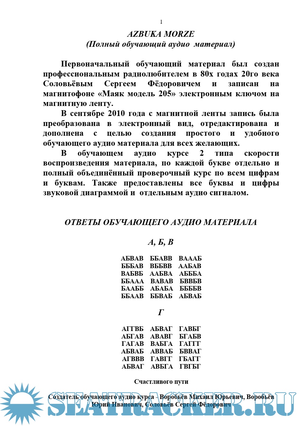 Описание: Первоначальный обучающий материал был создан профессиональным радиолюбителем в 80х годах 20го века Соловьёвым Сергеем Фёдоровичем и записан на магнитофоне «Маяк модель 205» электронным ключом на магнитную ленту. В сентябре 2010 года с магнитной ленты запись была преобразована в электронный вид, отредактирована и дополнена с целью создания простого и удобного обучающего аудио материала для всех желающих.