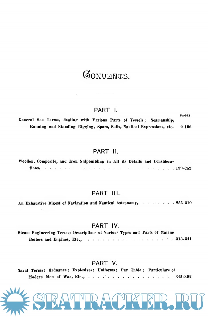Description: Five thousand nautical subjects, five hundred descriptive engravings, five parts bound in one volume. "A work of reference for Naval, Revenue, Coast Survey, Transport and Light House Services, Merchant Marine Officers, Yachtsmen, U.S. Local Inspectors of Steam Vessels, Builders of Wooden and Iron Steam and Sailing Ships, Admiralty Lawyers, Under-writers, Naval Cadets and Young Men on board of State Training Vessels, Marine Draughtsmen, Builders of Engines and Boilers, and Adapted for the use of the Naval Reserve."