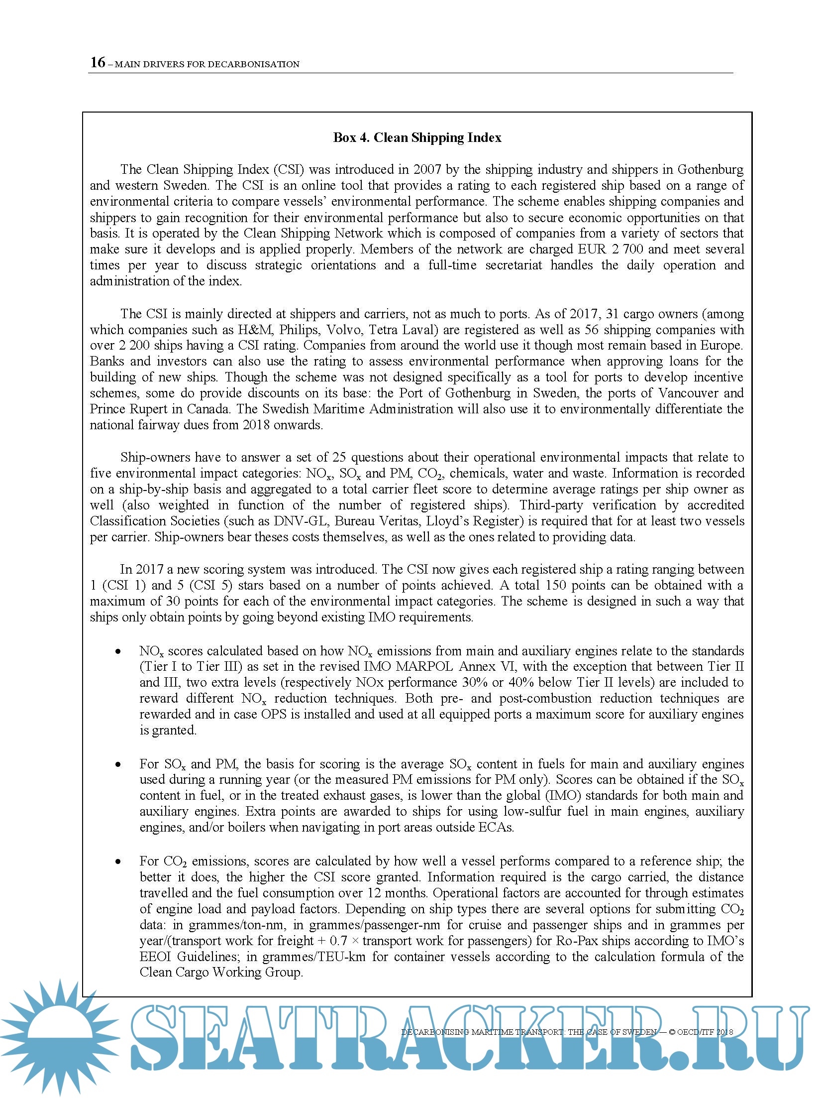 Year: 2018 Language: english Author: International Transport Forum Genre: Research papers Format: PDF Quality: eBook Pages count: 30 Description: The Swedish shipping industry has been very active in decarbonising shipping. Its industry association has formulated a target of zero-carbon shipping by 2050 and various Swedish shipping companies are pioneers in low-carbon shipping. The country now counts a number of innovative green vessels projects. Stena Line runs a ferry on methanol; Sirius Shipping has developed a ship-to-ship LNG bunkering vessel; numerous Swedish shipping companies - such as Terntank, Erik Thun and Rederi Gotland – have pioneered services with LNG-propelled vessels; and both HH Ferries and Green City Ferries have introduced electric ships. This pro-active approach in Sweden is driven by an effective partnership of responsible shipping companies and shippers. Most Swedish shipping companies are family owned, and most shipping families are traditionally located in Donsö, a de facto maritime cluster that stimulates trust to cooperate in developing green and innovative ships. The interest of Swedish ship-owners in sustainability and innovation has been encouraged by large Swedish shippers, such as the energy company Preem, that are dedicated to green supply chains. This has resulted in partnerships between shippers and shipping companies that overcome barriers that have traditionally hampered progress in greening shipping. In particular the willingness of certain shippers to commit to long-term charter contracts with the new lowcarbon ships seems to have been a main determining factor.