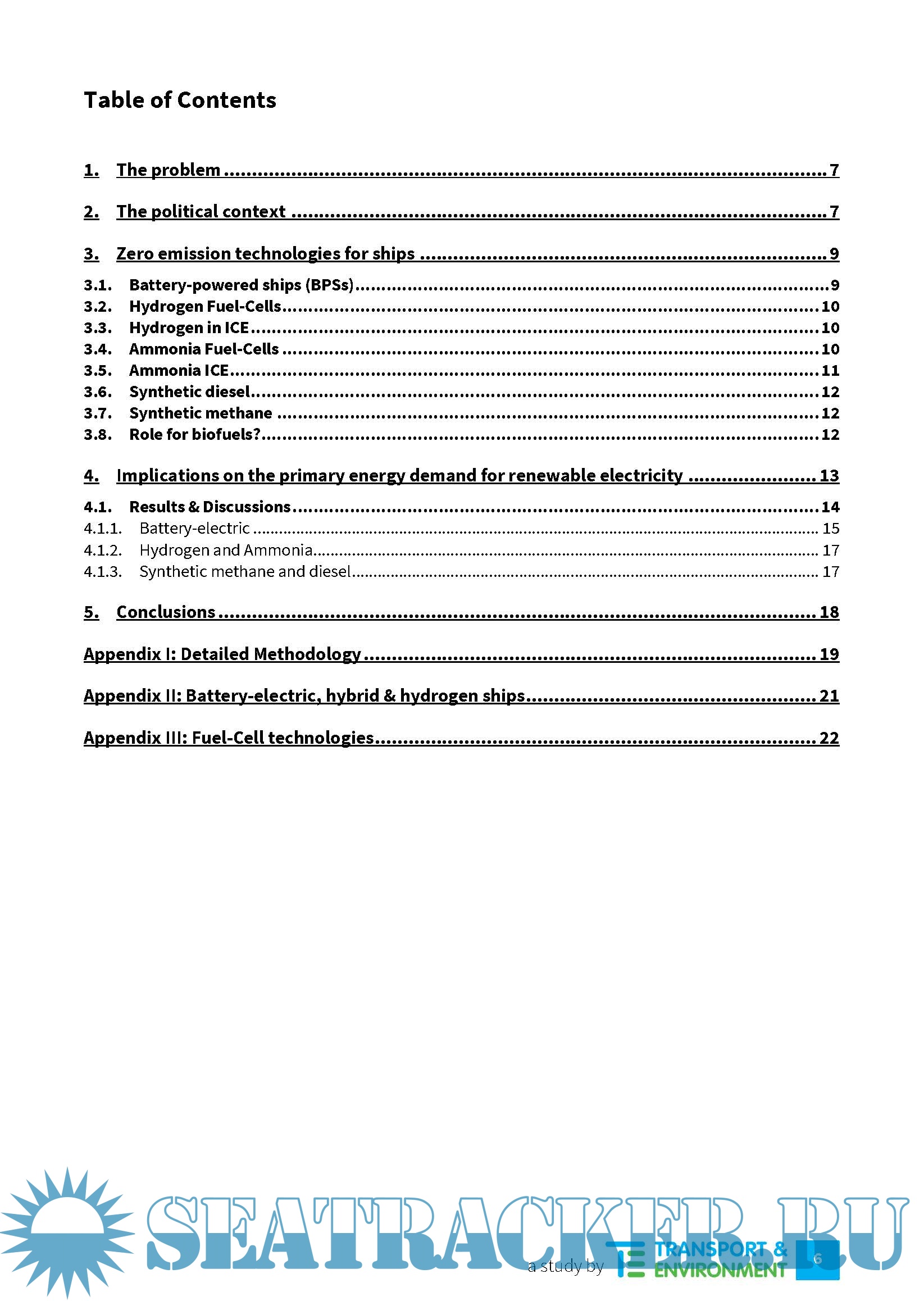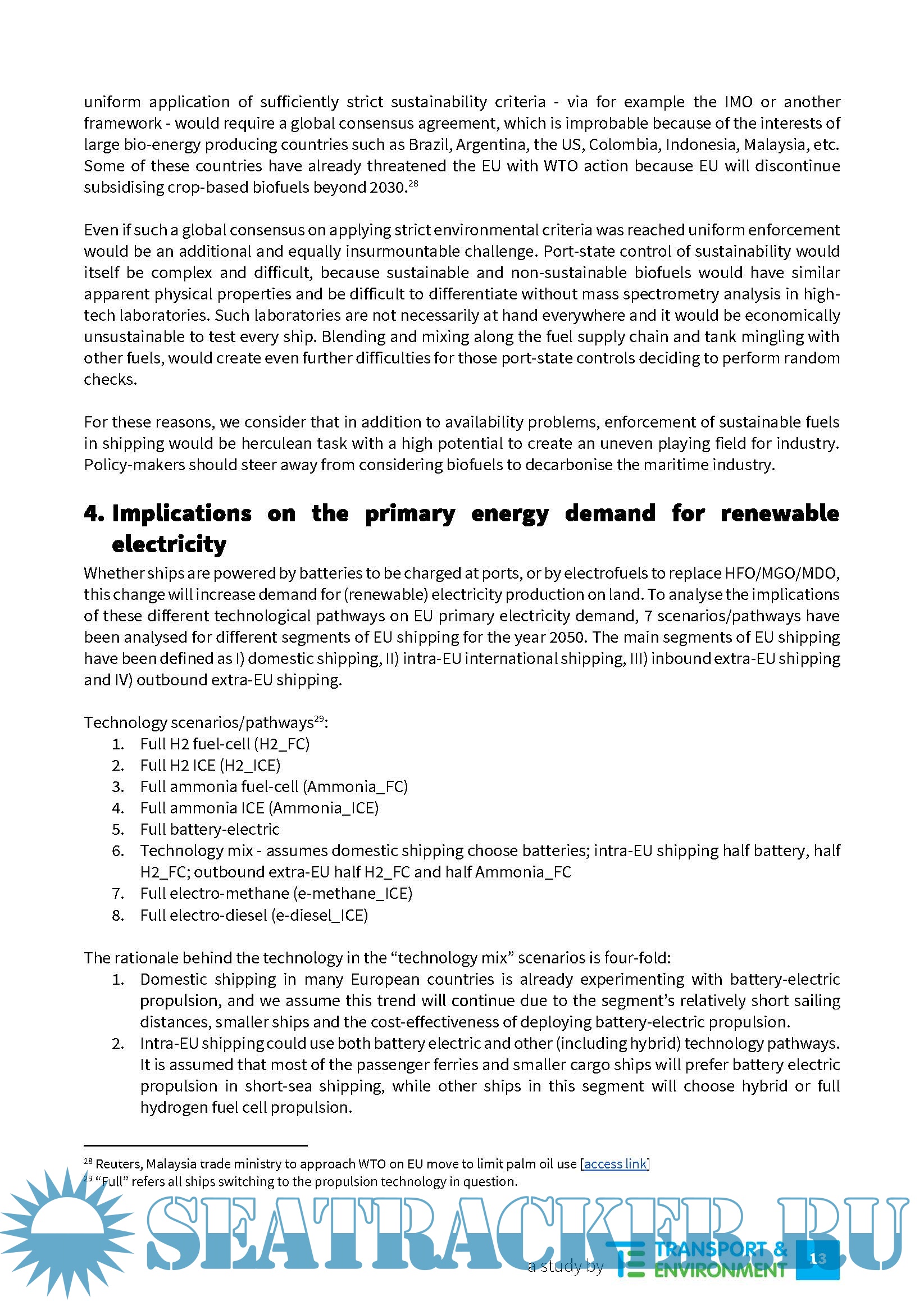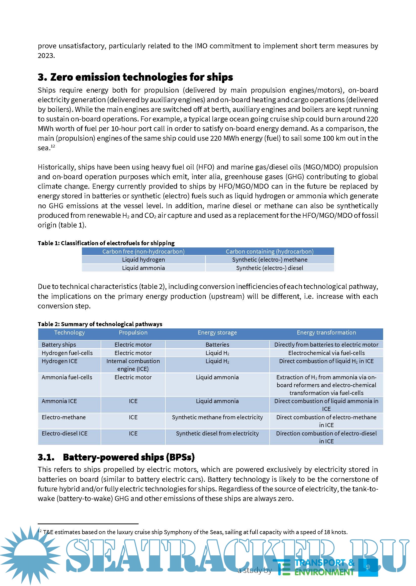 Description: Shipping is one of the largest greenhouse gas (GHG) emitting sectors of the global economy, responsible for around 1 Gt of CO2eq every year.1 If shipping were a country, it would be the 6th emissions, emitting on average 200 Mt/year.2 This report assesses potential technology pathways for decarbonising EU related shipping through a shift to zero carbon technologies and the impact such a move could have on renewable electricity demand in Europe. It also identifies key policy and sustainability issues that should be considered when analysing and supporting different technology options to decarbonise the maritime sector. The basis of the study is outbound journeys under the geographical scope of the EU ship MRV Regulation. We have not tried to quantify the emissions reductions that specific regulatory measures to be introduced at the IMO or EU level might contribute towards decarbonisation by 2050 because there are too many uncertainties. We have taken a more limited first approach and investigated how zero carbon propulsion pathways that currently seem feasible