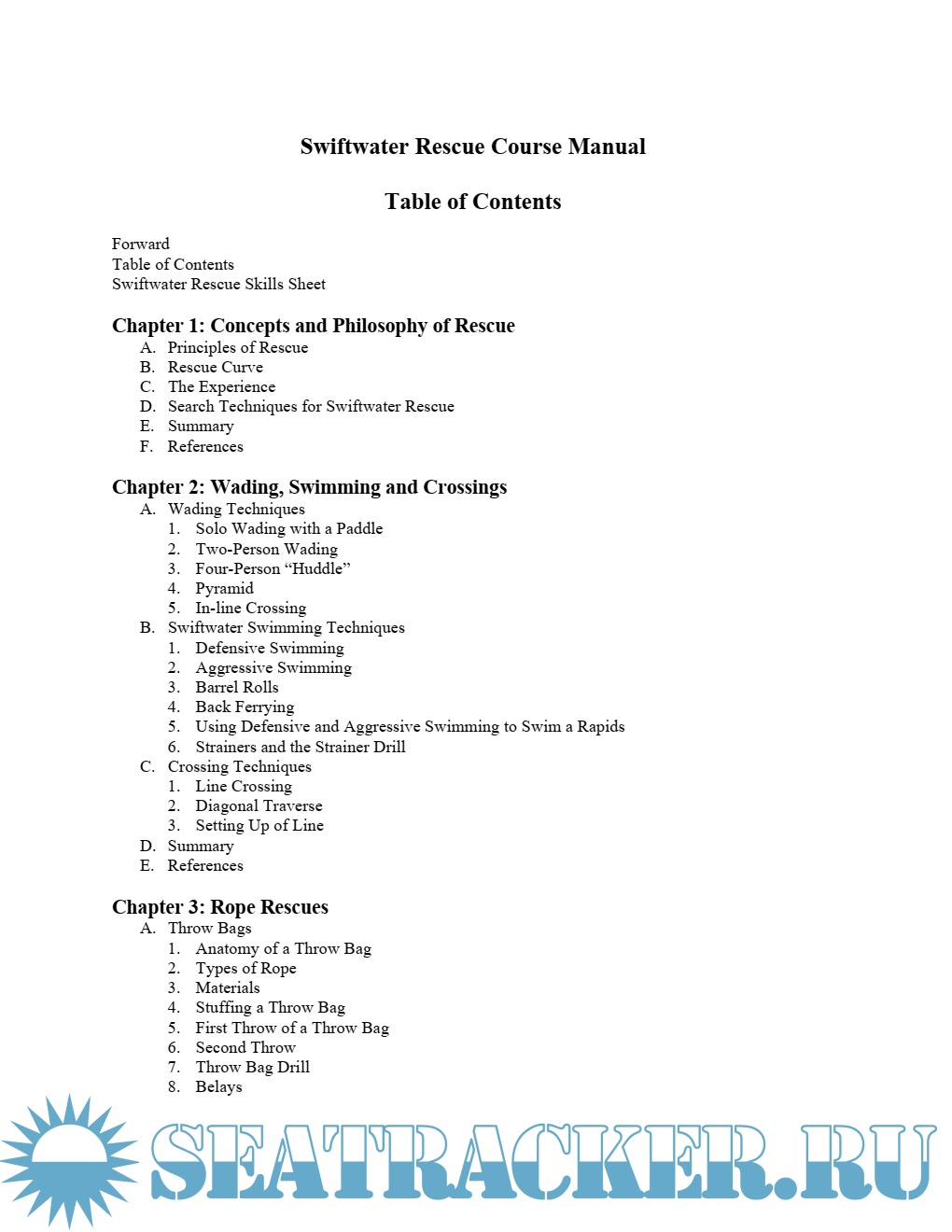 Year: 2018 Language: english Author: Kauffman R.B. Publisher: Kauffman R.B. Format: PDF Quality: Scanned pages Pages count: 106 Description: Swiftwater Rescue Course Manual: The Swiftwater Rescue Manual was developed by rbk who is responsible for its contents. People are welcome to use any and all the materials. They do so with the following stipulations. 1. Users using the materials acknowledge that they are knowledgeable in swiftwater rescue and know how to use the materials contained herein. These materials are provided to assist people already knowledgable and trained in swiftwater rescue. [Yes, this is a disclaimer.] 2. The author has attempted to be accurate and has not purposely created false information. Again, users of these materials assume that they are knowledgable and can determine for themselves any errors or incorrect information. [Yes, this is a disclaimer.] 3. In an effort to advance SWR, these materials are offered free. Anyone who uses the materials, in part or in full, may do so. The only request is to provide rbk with the appropriate acknowledgement for the materials used. In other words, acknowledge and don't plagiarize. Use, but don't abuse. Recognize the source.