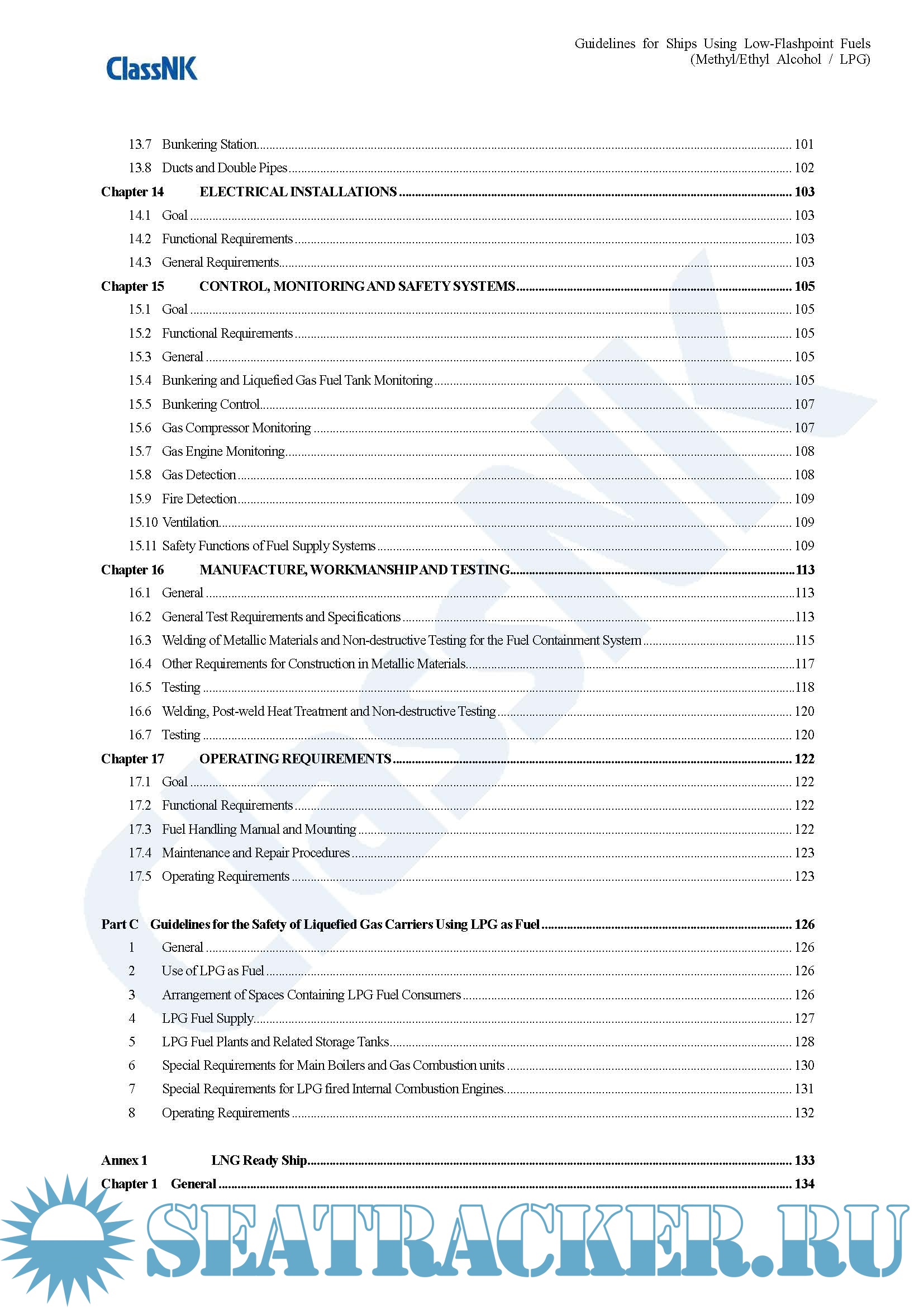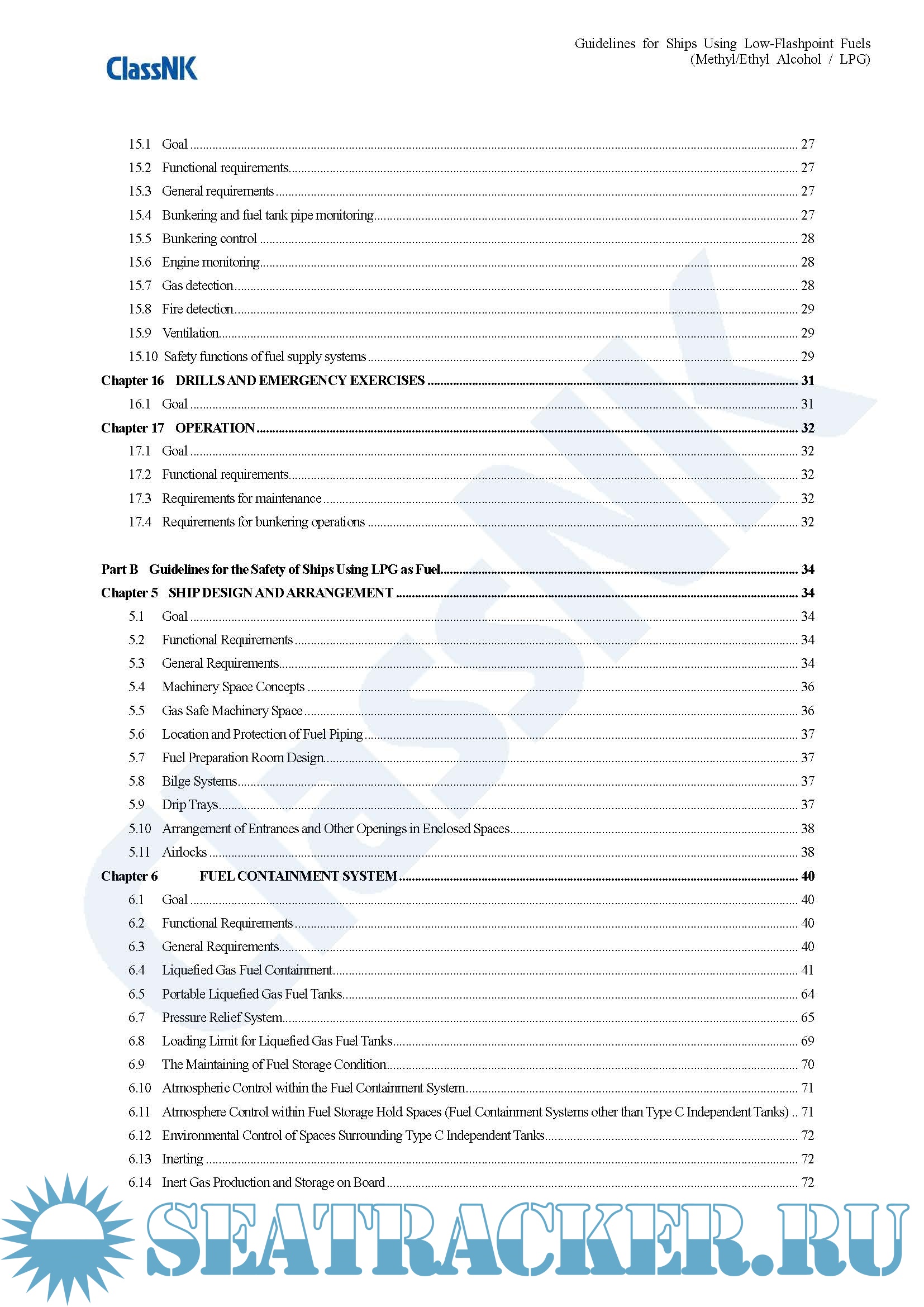 Chapter 2 to 17 of these guidelines are based on IGF Code. Chapter 2 to 4 provide functional requirements and general requirements for ships using low-flashpoint fuel (except for liquefied gas carriers) and Chapter 5 to 17 separately provide special requirements as Part A which apply to ships using methyl/ethyl alcohol as fuel and as Part B which apply to ships using LPG as fuel. On the other hand, Part C of these guidelines provide the safety requirements based on Chapter 16 of IGC Code which apply to liquefied gas carriers using LPG as fuel in addition to the relevant requirements of IGC Code.