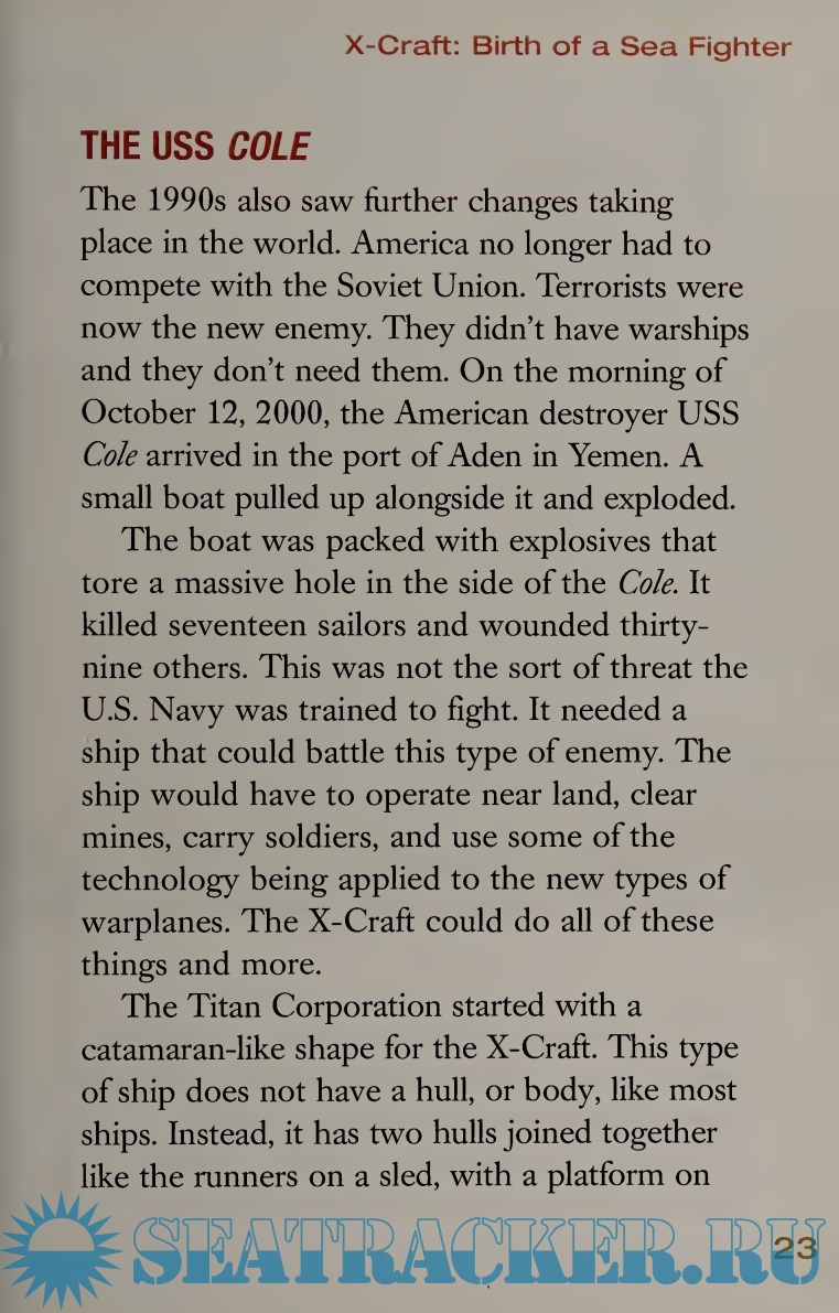 Description: Sea Fighter (FSF-1) is an experimental littoral combat ship under development (2005–2008) by the United States Navy. Its hull is of a small-waterplane-area twin-hull (SWATH) design, provides exceptional stability, even on rough seas. The ship can operate in both blue and littoral waters. For power, it can use either its dual gas-turbine engines for speed or its dual diesel engines for efficient cruising. It can be easily reconfigured through the use of interchangeable mission modules. Helicopters can land and launch on its deck. Smaller water craft can be carried and launched from its stern. The vessel is being developed under the program title Littoral Surface Craft-Experimental (LSC(X)) with a hull type designation Fast Sea Frame. The first vessel has been assigned the hull classification symbol FSF 1 and also has been referred to as the X-Craft. The vessel was designed by British company BMT Nigel Gee Ltd (formerly BMT Nigel Gee and Associates Ltd) who continue with a role in the development of the vessel.