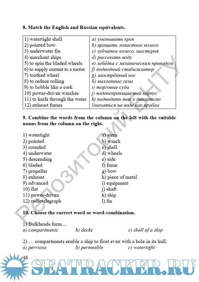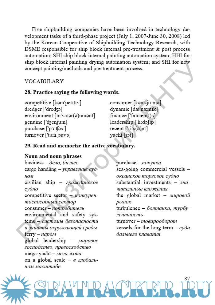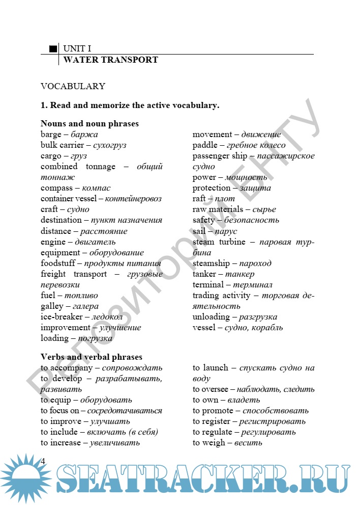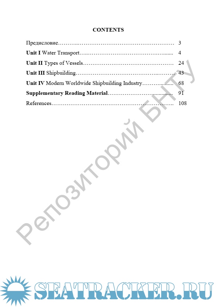 Пособие предназначено для студентов, обучающихся по специальности 1-37 03 02 «Кораблестроение и техническая эксплуатация водного транспорта». Может быть использовано широким кругом читателей, желающих повысить и расширить уровень владения иностранным языком в области эксплуатации водного транспорта.