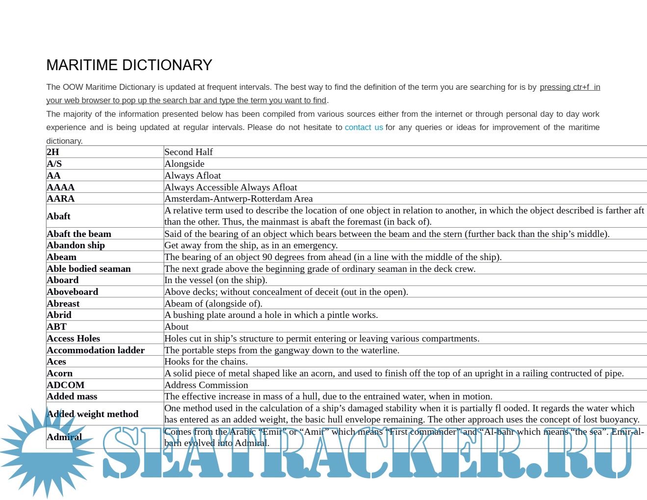 Description: The OOW Maritime Dictionary is updated at frequent intervals. The best way to find the definition of the term you are searching for is by pressing ctr+f in your web browser to pop up the search bar and type the term you want to find.