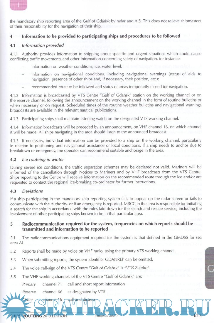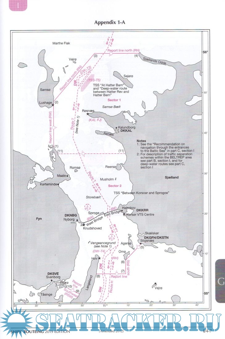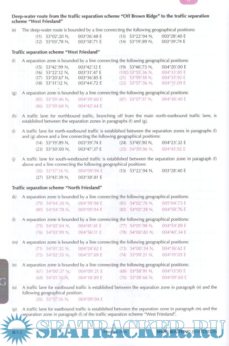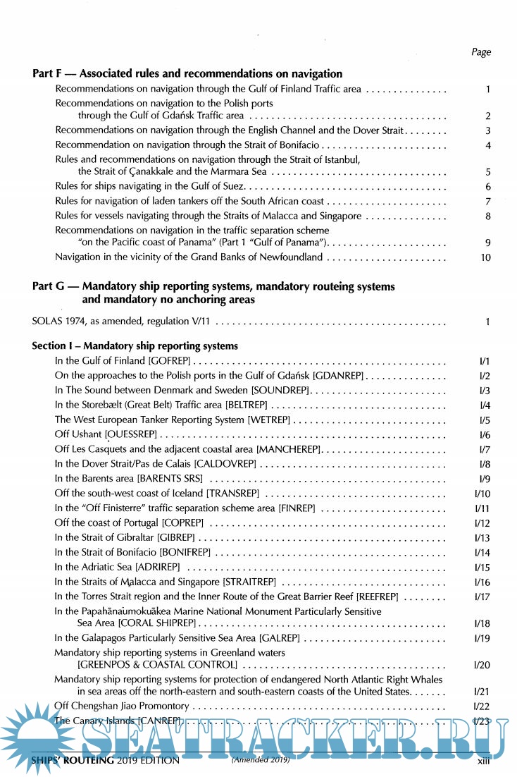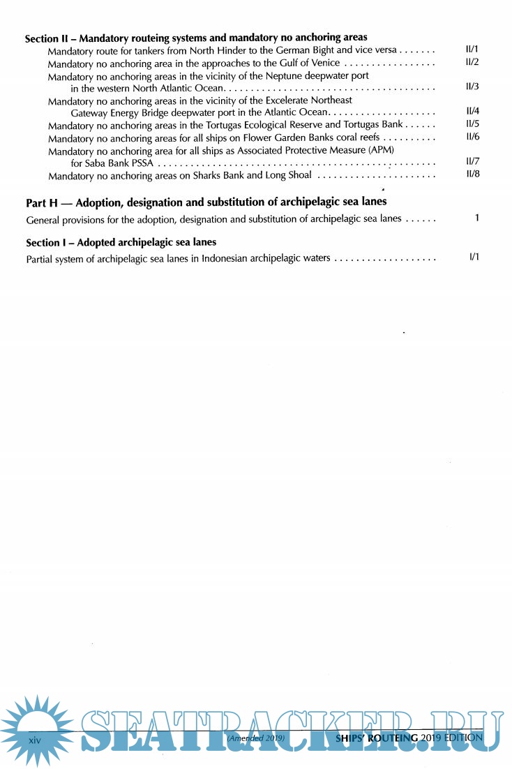 as recommended tracks, two-way routes and recommended directions of traffic flow), F (the rules and recommendations on navigation that are associated with particular traffic areas and straits), G (mandatory ship reporting systems, mandatory routeing systems and mandatory no anchoring areas) and H (archipelagic sea lanes).