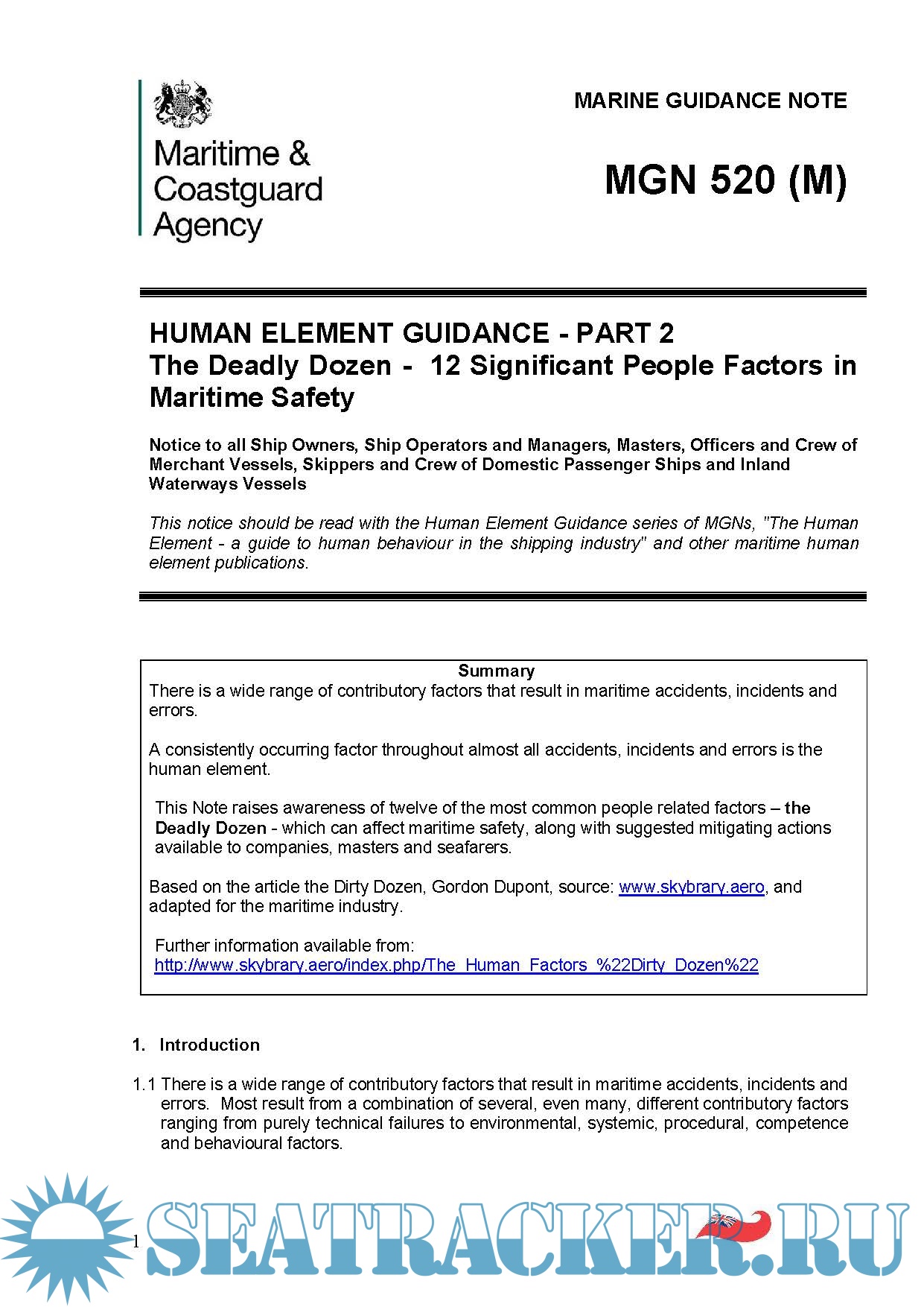 1. Human Element Guidance Part 1, MGN 505 (25 pages), Published 31 March 2014 - Last updated 6 January 2017 2. Human Element Guidance Part 2, MGN 520 (17 pages), Published 5 January 2017
