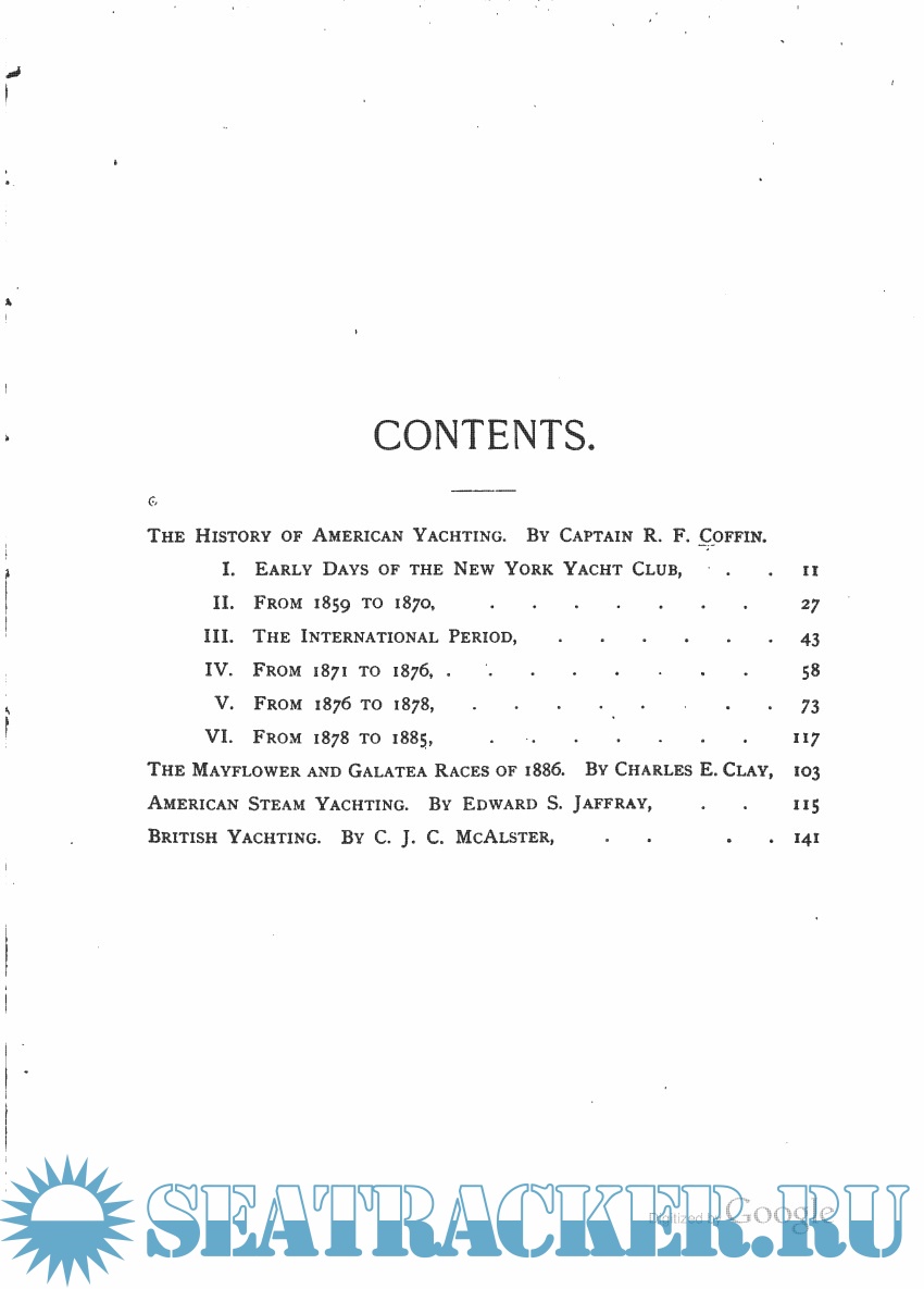 Description: "Contains a history of American yachting from the early days of the New York Yacht Club to 1885 by Captain R. F. Coffin; the Mayflower and Galatea races of 1886, by Charles E. Clay; American steam yachting, by Edward S. Jaffray; and British yachting, by C. J. C. McAlister. The illustrations are line drawings of famous yachts, with captions telling about their owners" (Toy).