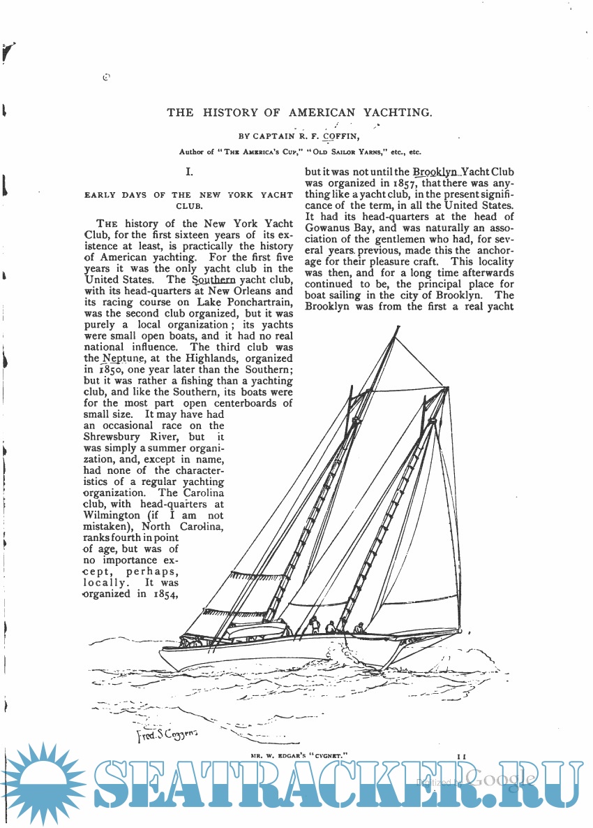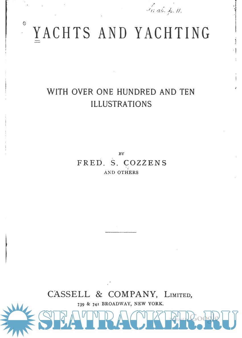 Year: 1887 Language: english Author: Cozzens F.S. Genre: Guide Publisher: Cassell & company, ltd. Format: PDF Quality: Scanned pages Pages count: 168 Description: "Contains a history of American yachting from the early days of the New York Yacht Club to 1885 by Captain R. F. Coffin; the Mayflower and Galatea races of 1886, by Charles E. Clay; American steam yachting, by Edward S. Jaffray; and British yachting, by C. J. C. McAlister. The illustrations are line drawings of famous yachts, with captions telling about their owners" (Toy).