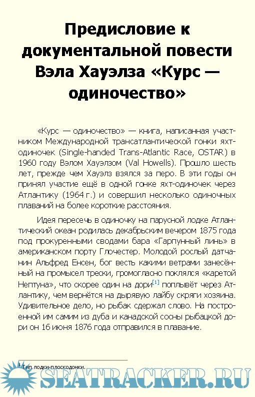 Описание: «Курс — одиночество» — книга, написанная участником Международной трансатлантической гонки яхт-одиночек в 1960 году Вэлом Хауэлзом. Прошло шесть лет, прежде чем Хауэлз взялся за перо. В эти годы он принял участие ещё в одной гонке яхт-одиночек через Атлантику (1964 г.) и совершил несколько одиночных плаваний на более короткие расстояния.