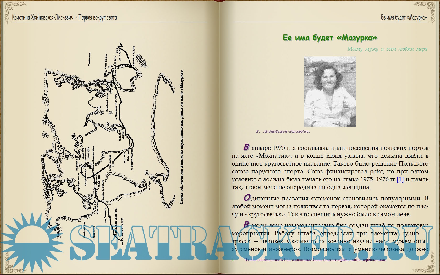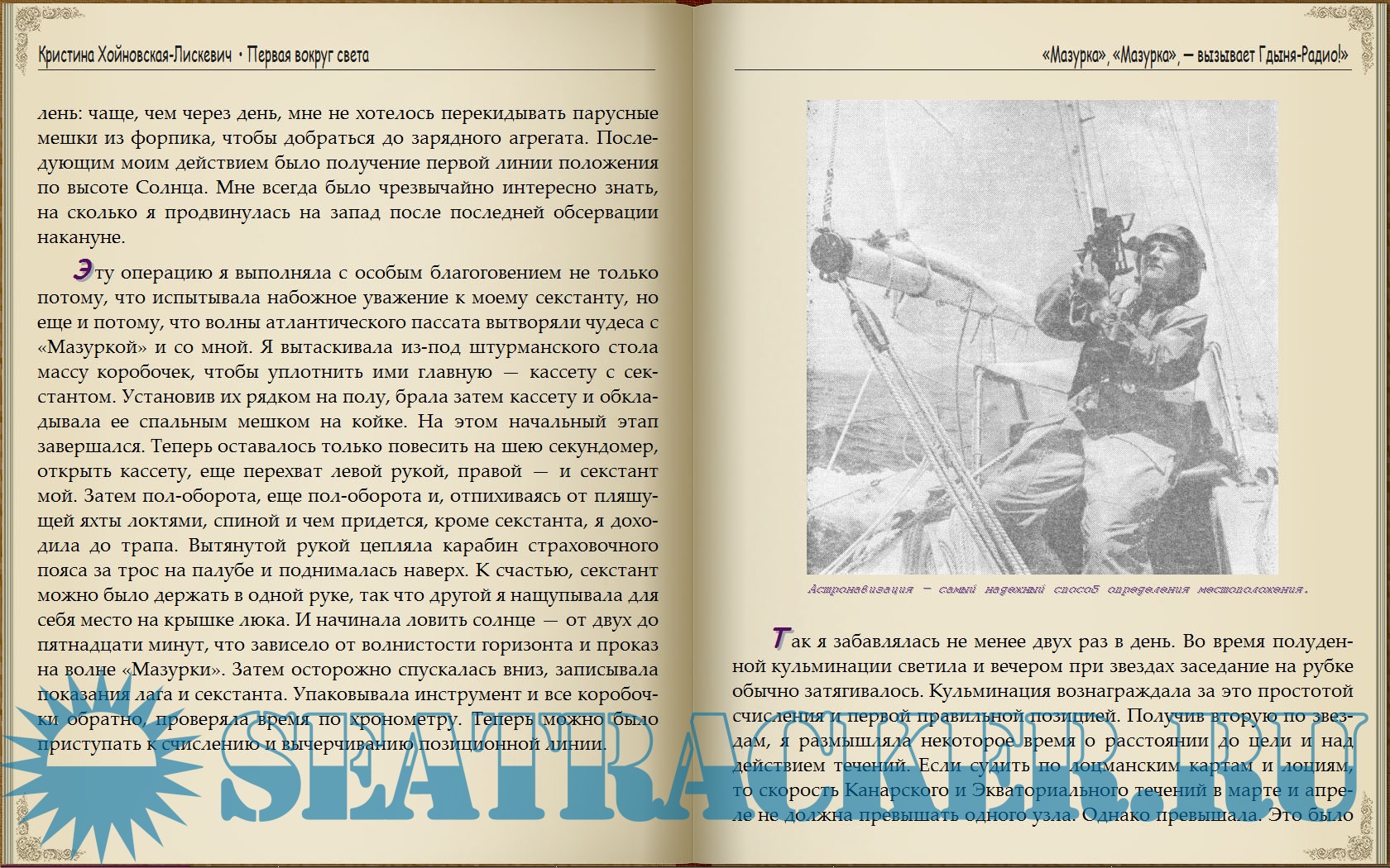 Описание: Автор книги — польская яхтсменка и инженер-судостроитель Кристина Хойновская-Лискевич — первая в мире женщина, которая совершила кругосветное плавание в одиночку на небольшой яхте «Мазурка». Плавание длилось два года, его и описывает в своей книге автор живо, увлекательно, с мягким юмором.