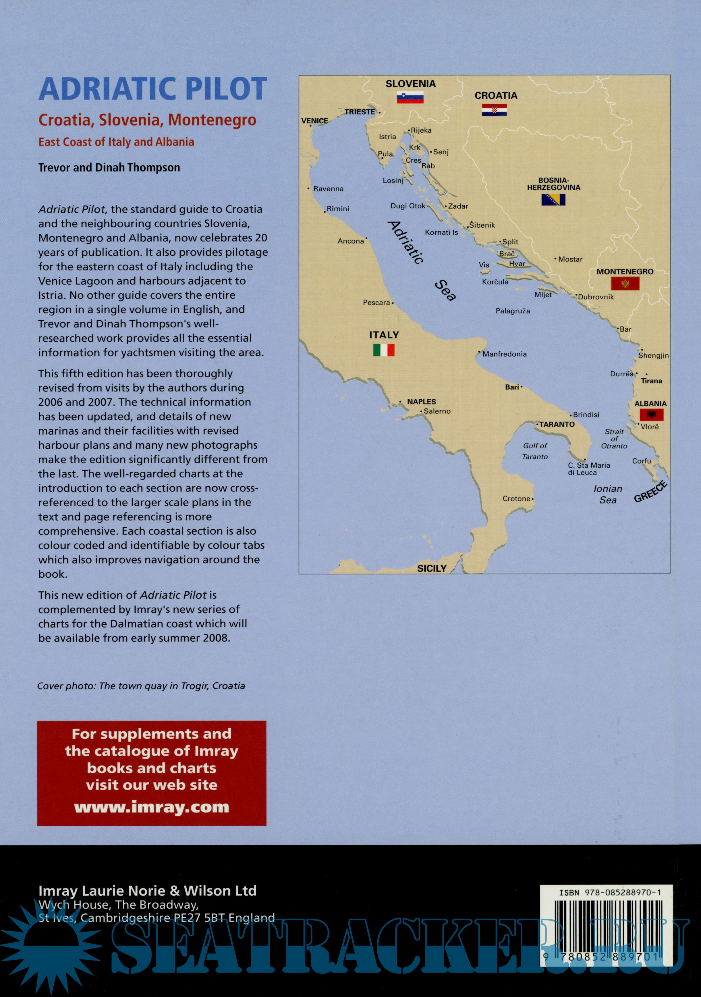 Description: Adriatic Pilot, the standard guide to Croatia and the neighbouring countries Slovenia, Montenegro and Albania, now celebrates 20 years of publication . It also provides pilotage for the eastern coast of Italy including the Venice Lagoon and harbours adjacent to Istria. No other guide covers the entire region in a single volume in English, and Trevor and Dinah Thompson's well researched work provides all the essential information for yachtsmen visiting the area.