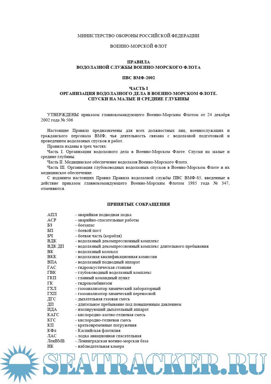 Правила водолазной службы Военно-Морского Флота. ПВС ВМФ-2002. Ч. I, II, III