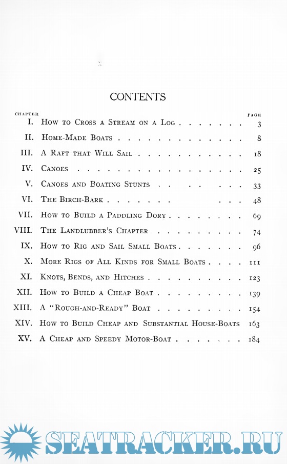 Year: 1931 Language: english Author: Beard D.C. Genre: Manual Publisher: Charles Scribner's Sons Format: PDF Quality: Scanned pages Pages count: 218 Description: This is not a book for yacht-builders, but it is intended for beginners in the art of boat-building, for boys and men who wish to make something with which they may navigate the waters of ponds, lakes, or streams. It begins with the most primitive crafts composed of slabs or logs and works up to scows, houseboats, skiffs, canoes and simple forms of sailing craft, a motorboat, and there it stops. There are so many books and magazines devoted to the higher arts of ship-building for the graduates to use, besides the many manufacturing houses which furnish all the parts of a sail-boat, yacht, or motor-boat for the ambitious boat-builder to put together himself, that it is unnecessary for the author to invade that territory. Many of the designs in this book have appeared in magazines to which the author contributed, or in his own books on general subjects, and all these have been successfully built by hundreds of boys and men. Additional info: The following makes the book unique: * This book contains unique sketched contextual illustrations that flow with the stories. * This book is carefully spell checked and edited to make the reading experience more pleasurable. * This book is the literal transcription of the physical copy originally published