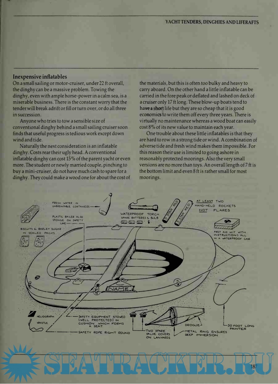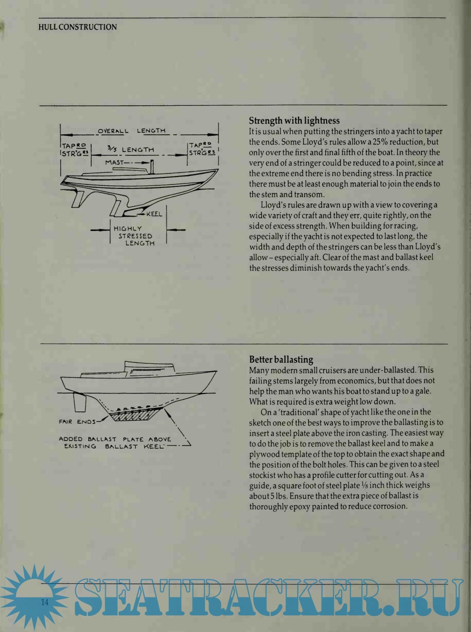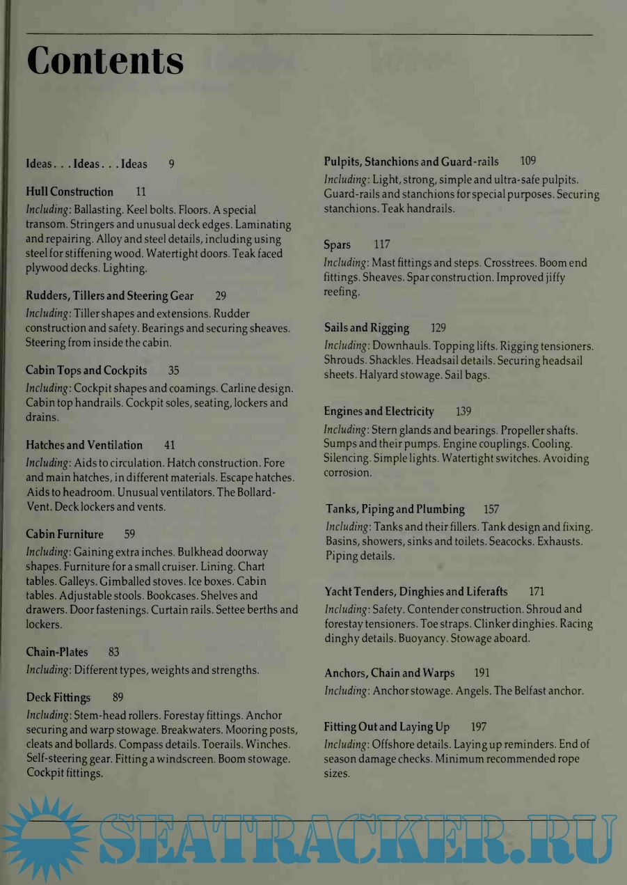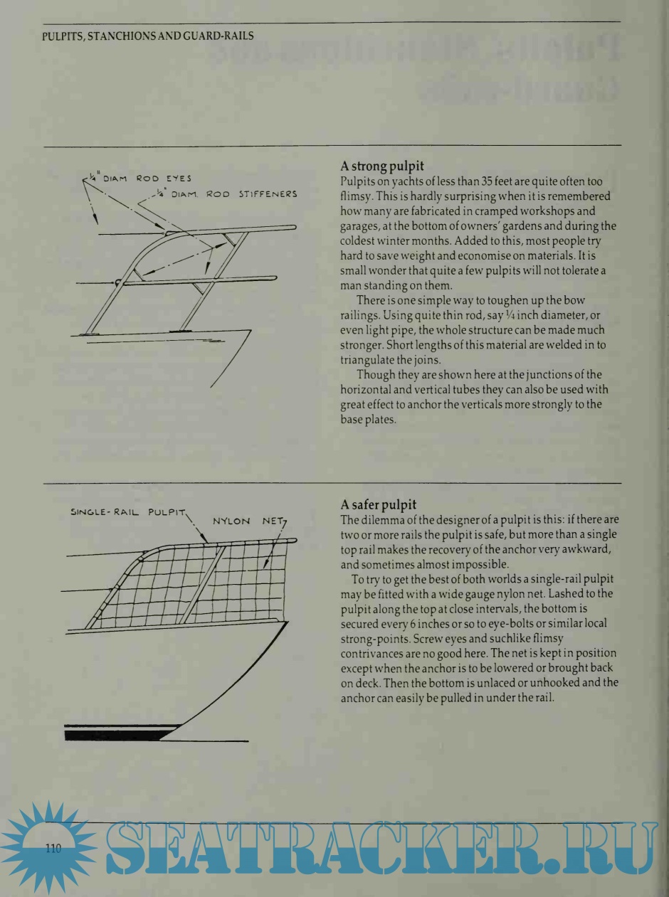 So it does pay to develop gadgets, and not expect total success right away. The drawings in this book are for the most part not dimensioned because the size of anything made will depend on the size of the boat it is to fit. What never changes is the need for excellent materials and fastenings. The cost of good glassfibre or stainless steel or varnish is little more than the shoddiest type; and the cost of materials is only a small percentage of the total cost.