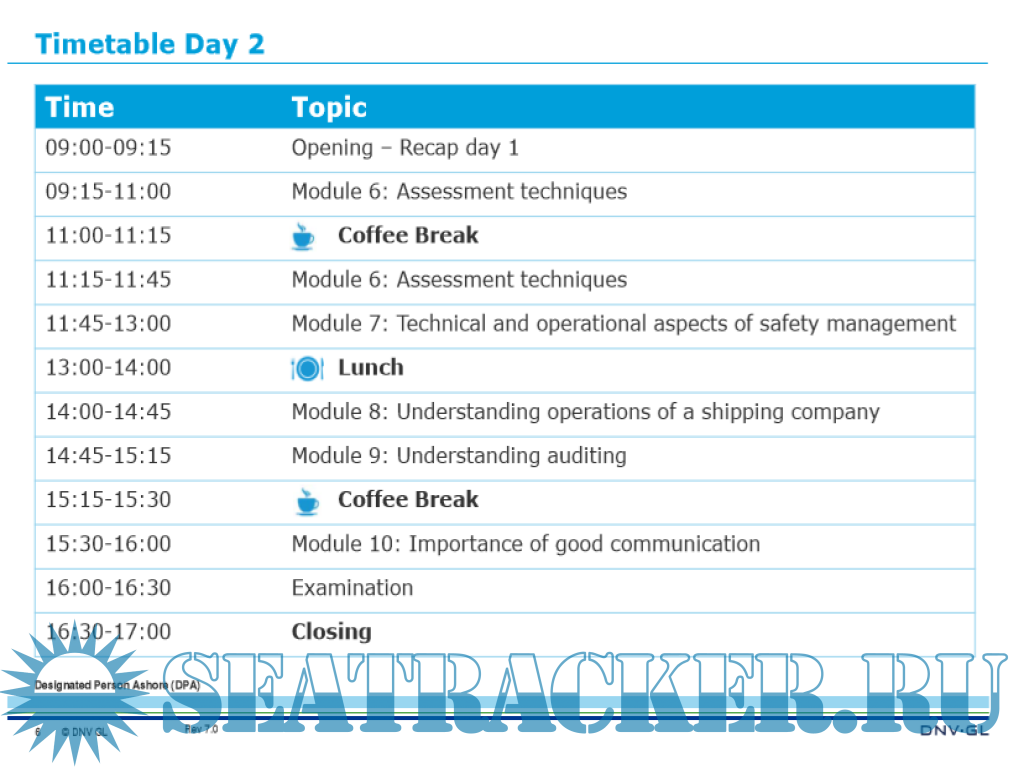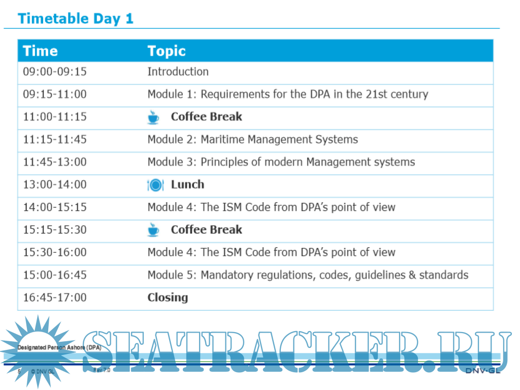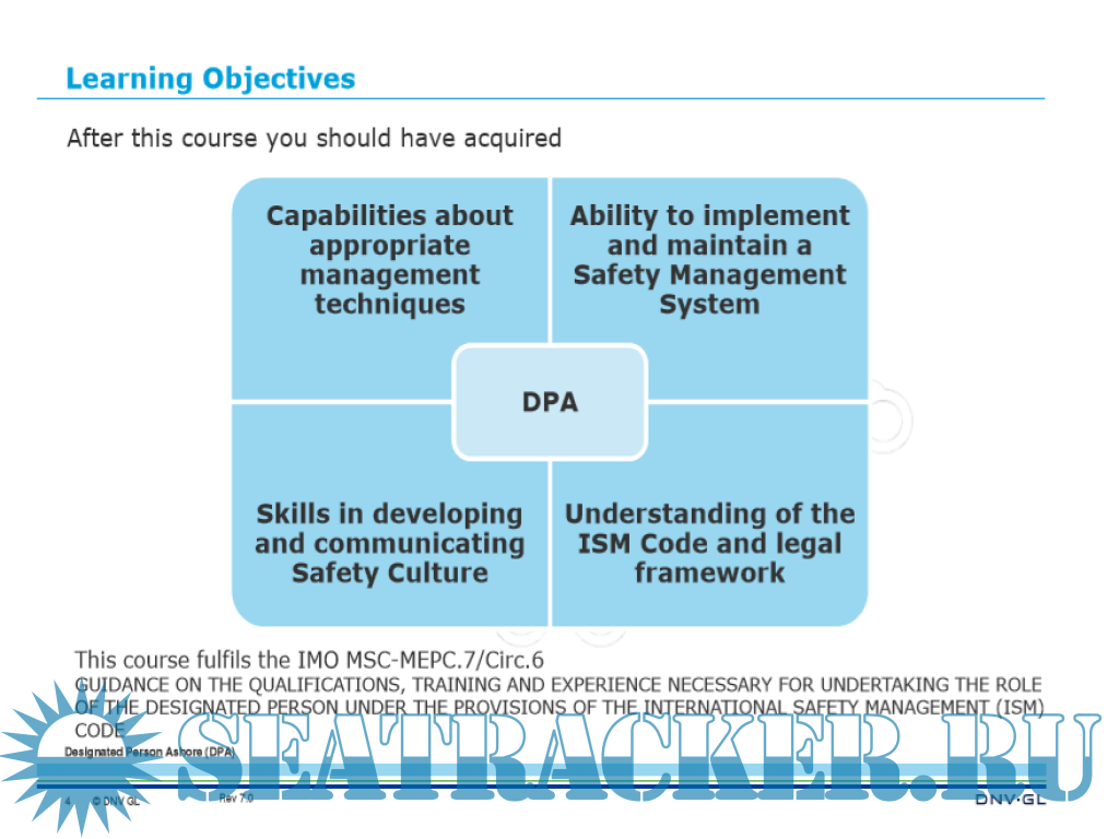 This course fulfills the IMO MSC-MEPC.7/ Circ.6 ”Guidance on the qualification, training and experience necessary for undertaking the role of the Designated Person under the provisions of the ISM Code