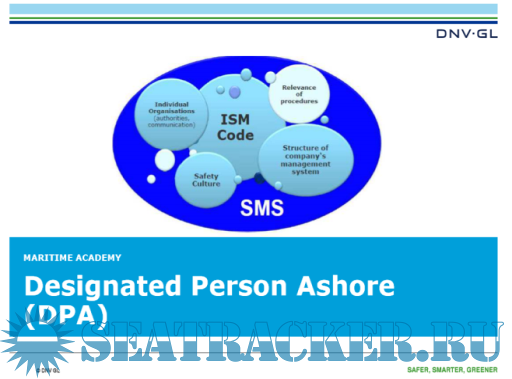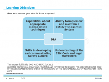 Description: According to the ISM Code the Designated Person Ashore (DPA) plays a key role in the effective implementation of a Safety Management System and takes responsibility for verification and monitoring of all safety and pollution prevention activities. To comply with the ISM Code a shipping company should be able to provide documentary evidence that the DPA has received sufficient training to undertake the necessary duties.