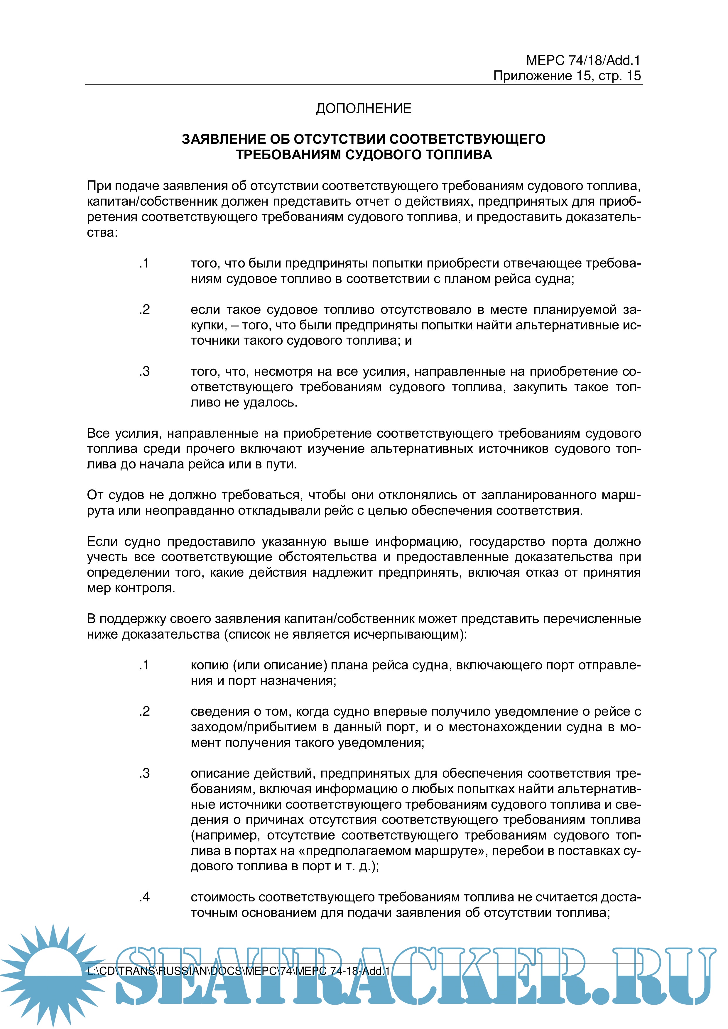 ДОПОЛНЕНИЕ. ЗАЯВЛЕНИЕ ОБ ОТСУТСТВИИ СООТВЕТСТВУЮЩЕГО ТРЕБОВАНИЯМ СУДОВОГО ТОПЛИВА