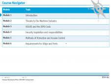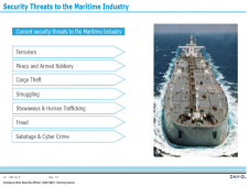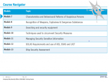The course focuses on: Development, implementation, maintenance and supervision of Ship Security Plans Identification of threats and vulnerabilities and assessment of security risks Methods for Inspection and Monitoring of security measures on board ships Operation, testing and calibration of security equipment and systems Enhancing security awareness and vigilance of company staff (ship and shore)