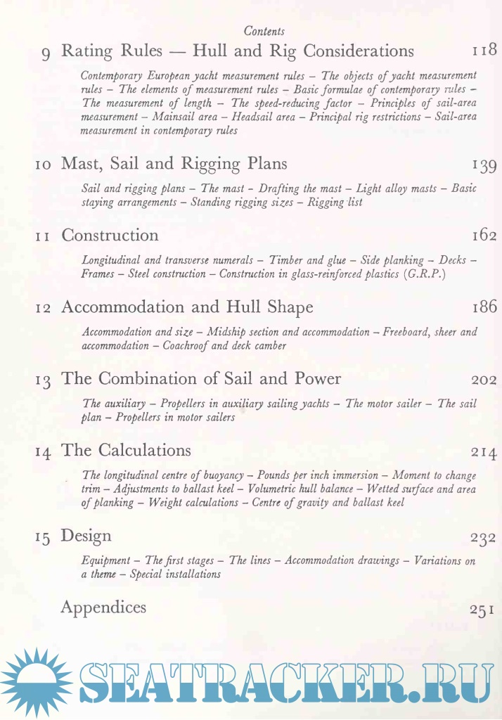 Mast, sail and rigging plans, construction, accommodation and hull shape and the combination of sail and power are all dealt with at length. Finally there is a chapter devoted to the calculations and another to the actual business of drawing designs.